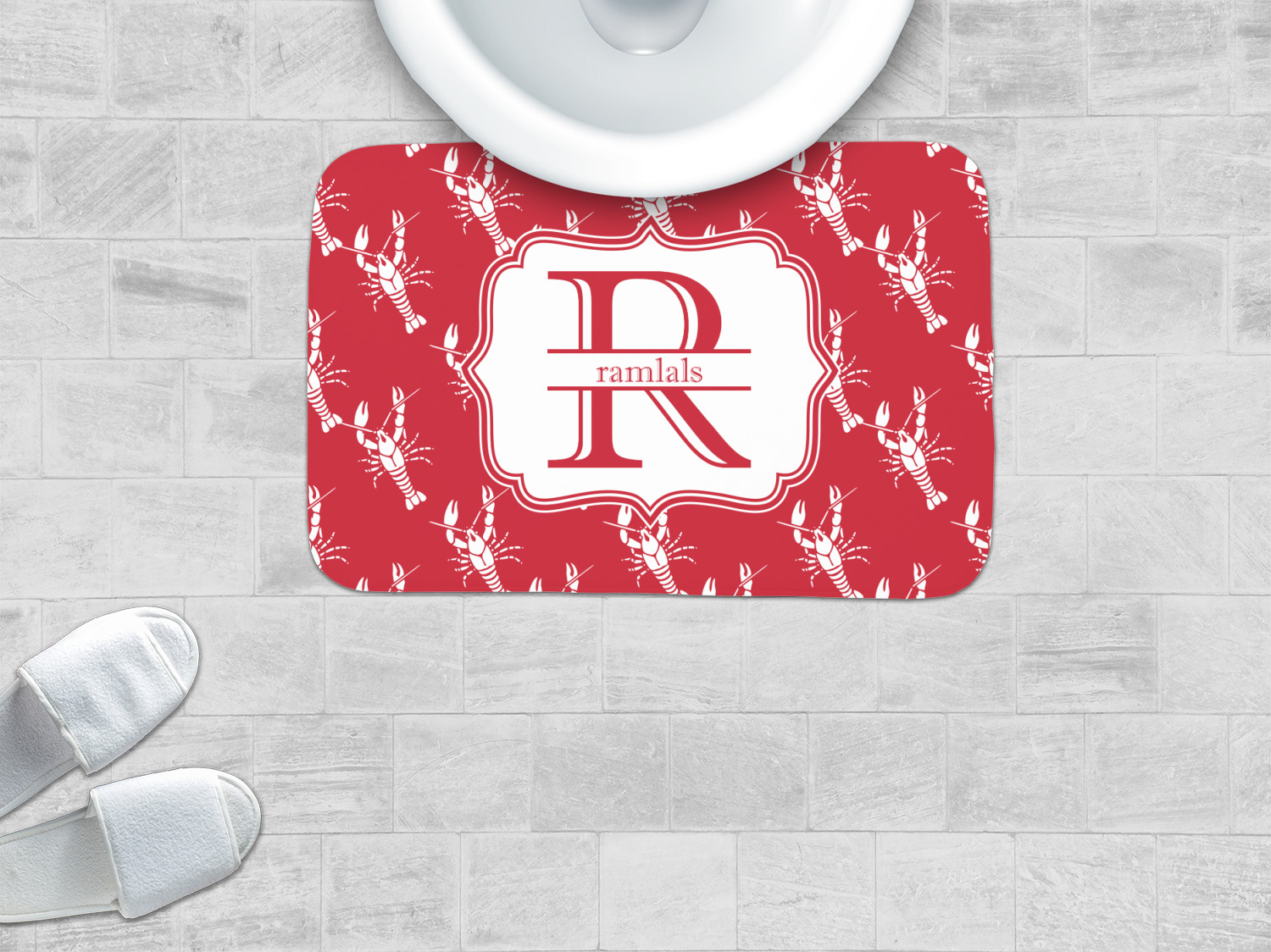 The design is done is a red background with white crawfish, while the personalization is inside a beautiful decorative rectangular frame. The personalization style is an initial along with the name.