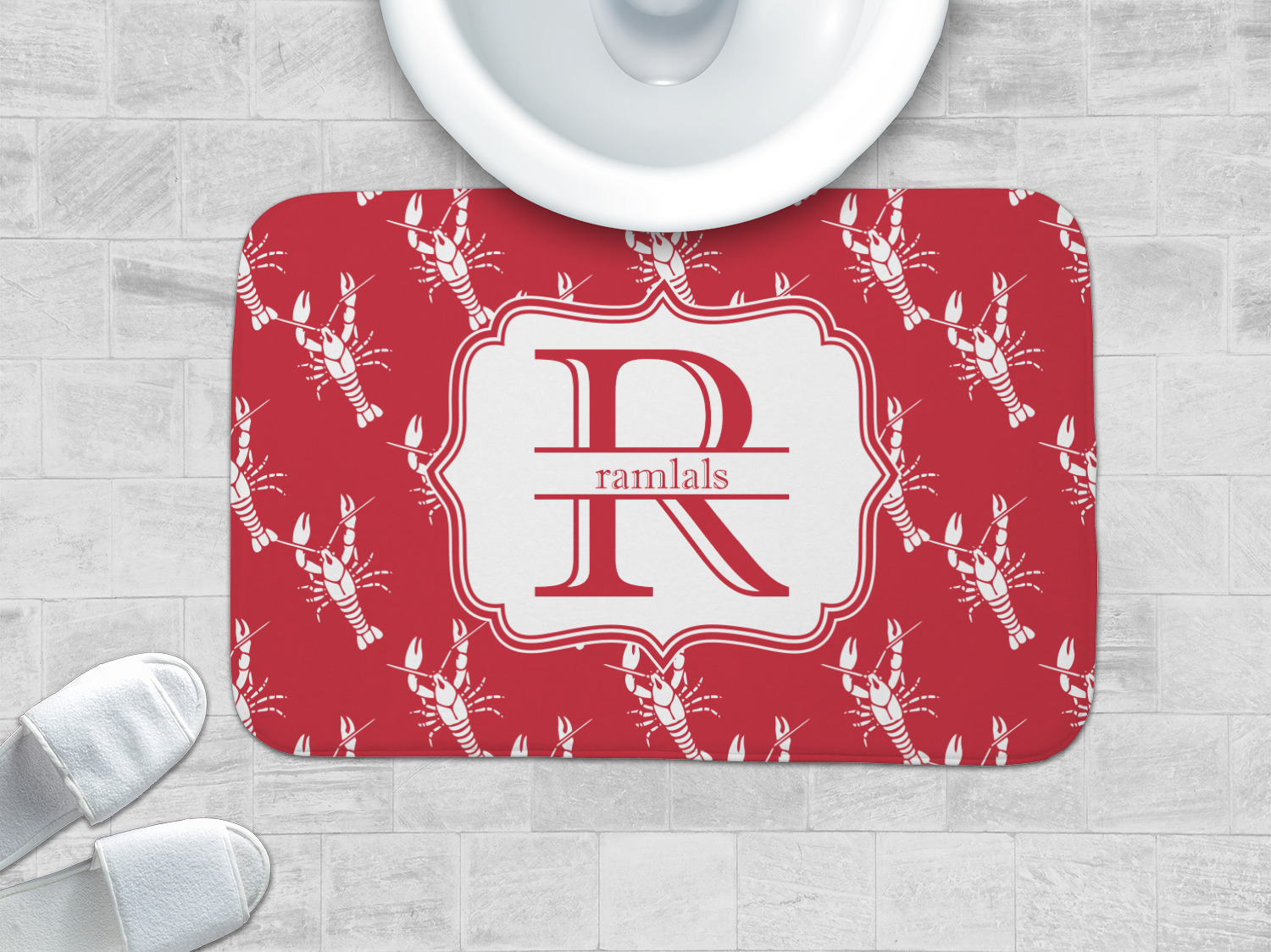 The design is done is a red background with white crawfish, while the personalization is inside a beautiful decorative rectangular frame. The personalization style is an initial along with the name.