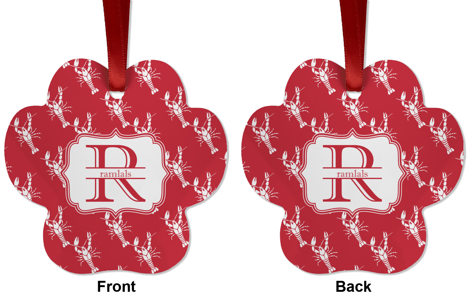 The design is done is a red background with white crawfish, while the personalization is inside a beautiful decorative rectangular frame. The personalization style is an initial along with the name.