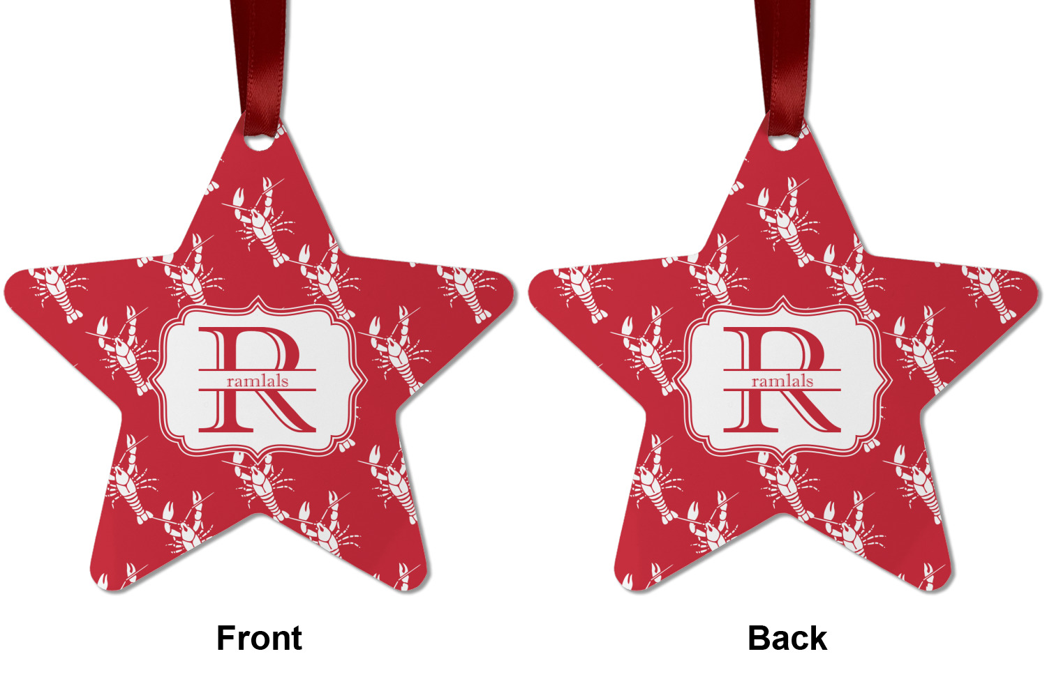 The design is done is a red background with white crawfish, while the personalization is inside a beautiful decorative rectangular frame. The personalization style is an initial along with the name.