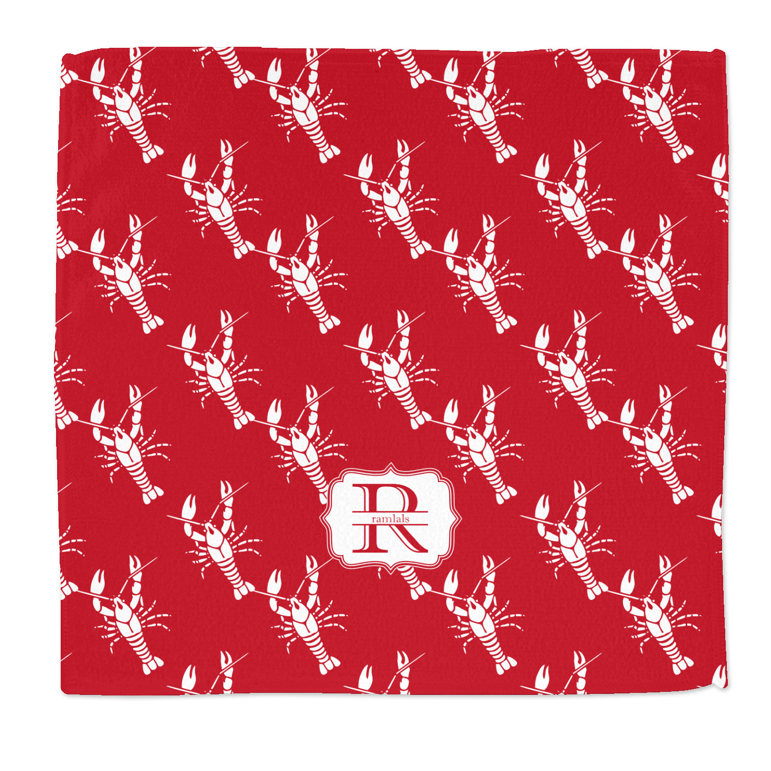 The design is done is a red background with white crawfish, while the personalization is inside a beautiful decorative rectangular frame. The personalization style is an initial along with the name.