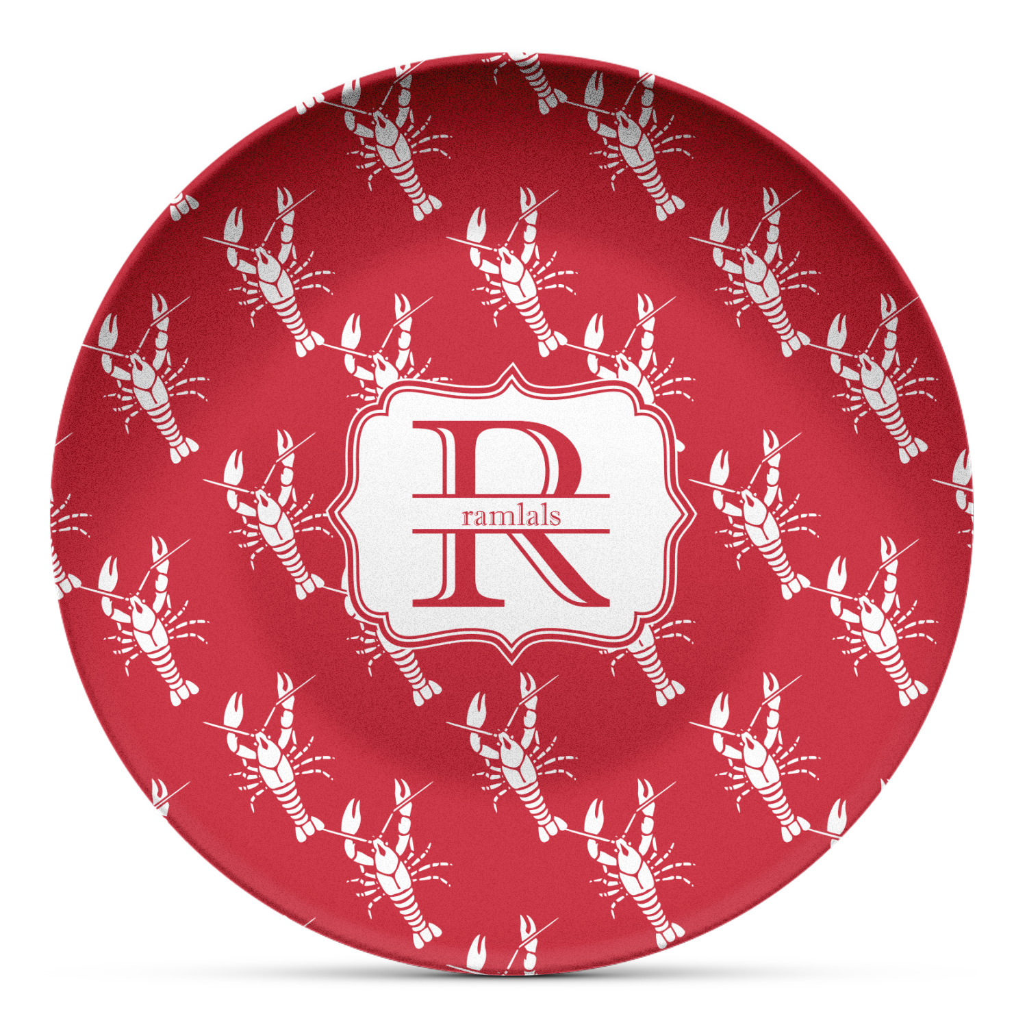The design is done is a red background with white crawfish, while the personalization is inside a beautiful decorative rectangular frame. The personalization style is an initial along with the name.