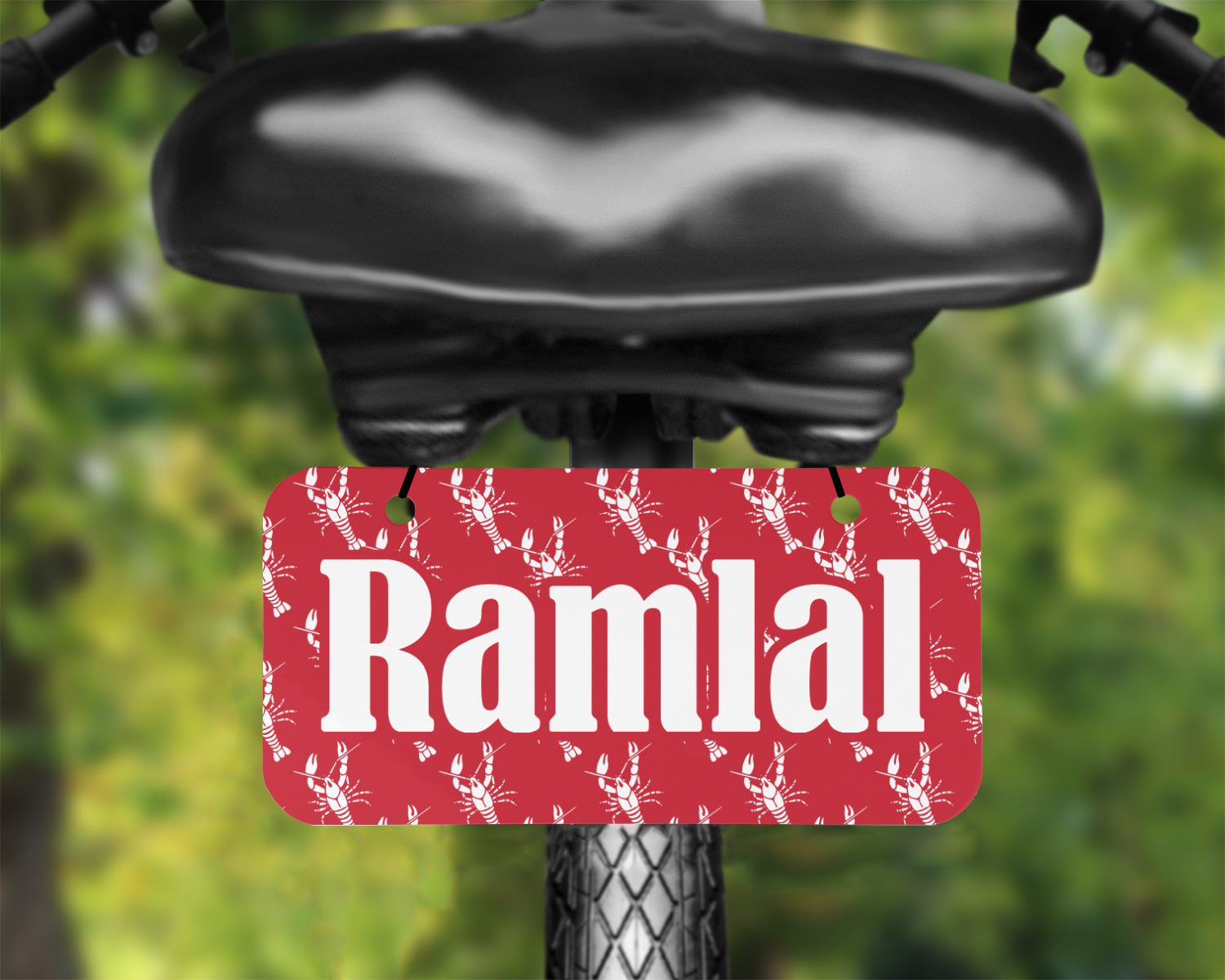 The design is done is a red background with white crawfish, while the personalization is inside a beautiful decorative rectangular frame. The personalization style is an initial along with the name.