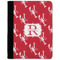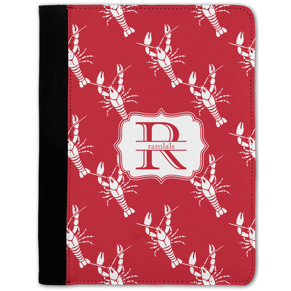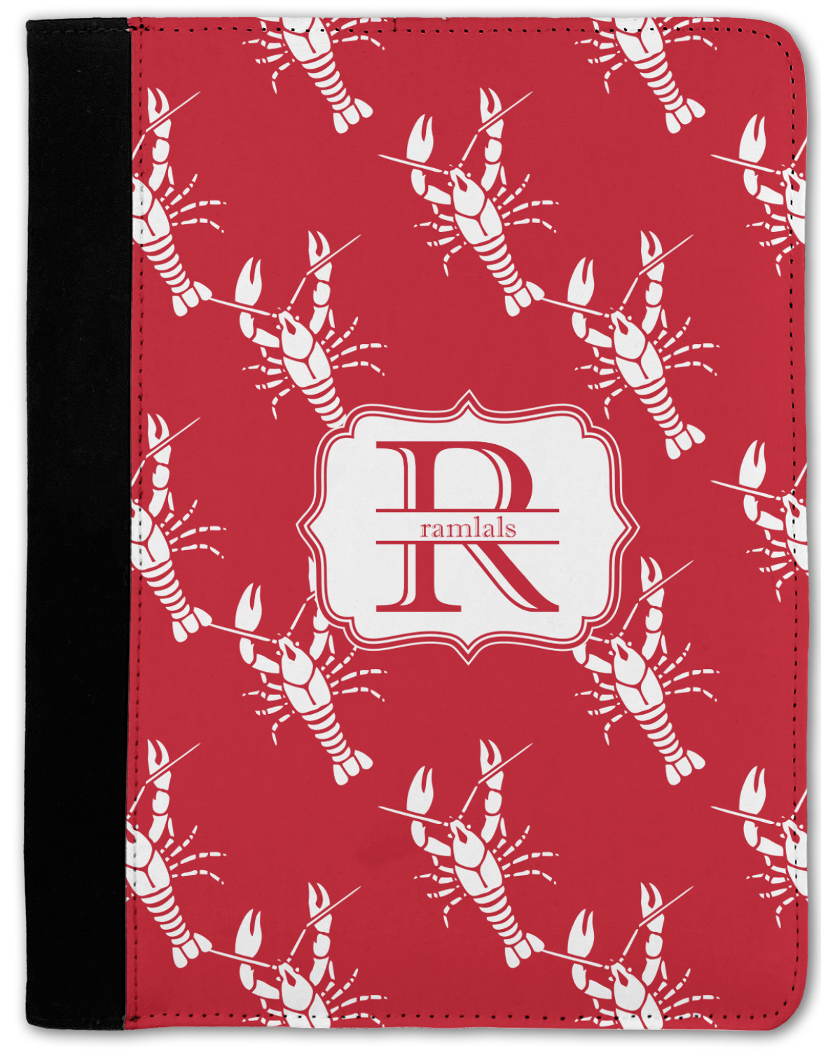 The design is done is a red background with white crawfish, while the personalization is inside a beautiful decorative rectangular frame. The personalization style is an initial along with the name.