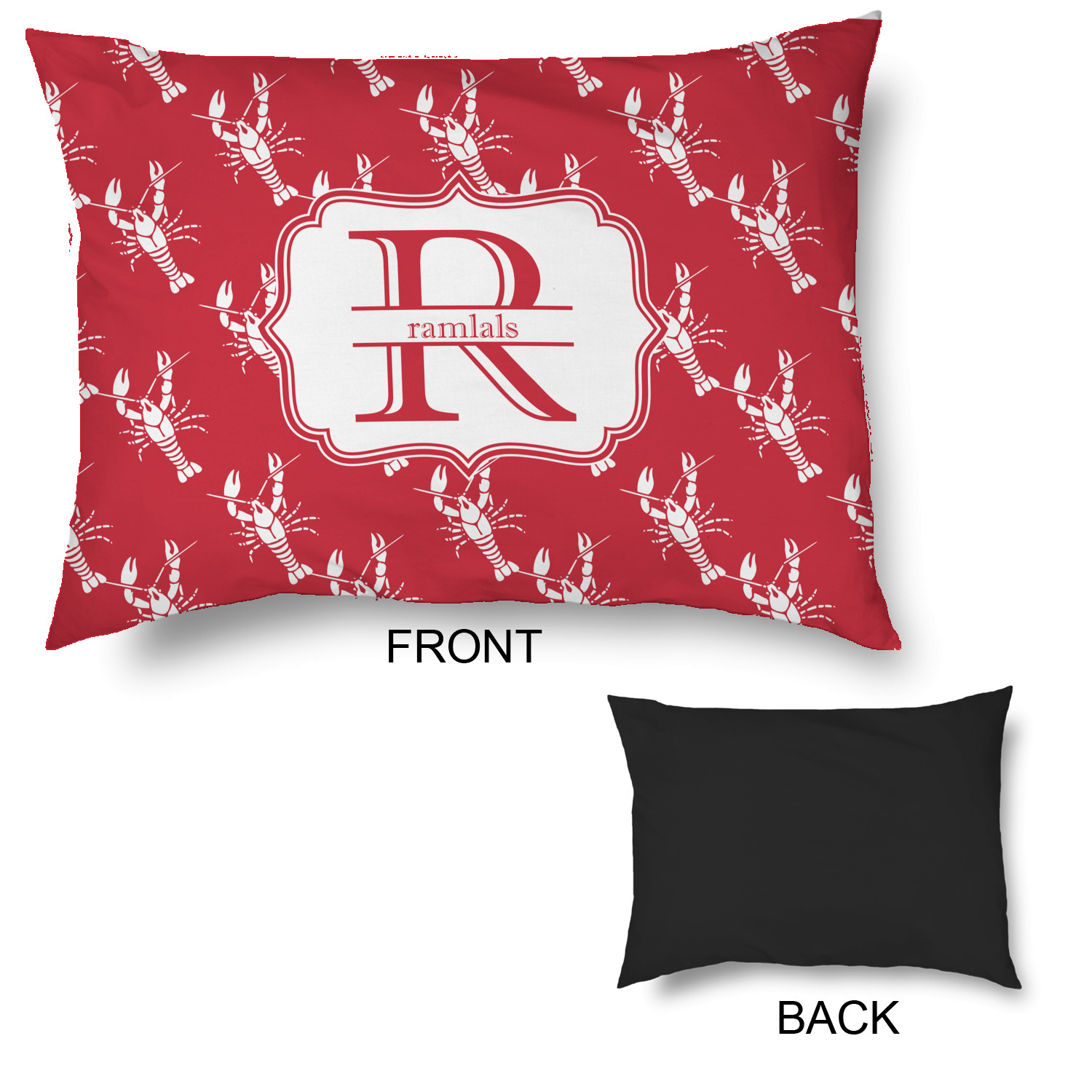 The design is done is a red background with white crawfish, while the personalization is inside a beautiful decorative rectangular frame. The personalization style is an initial along with the name.