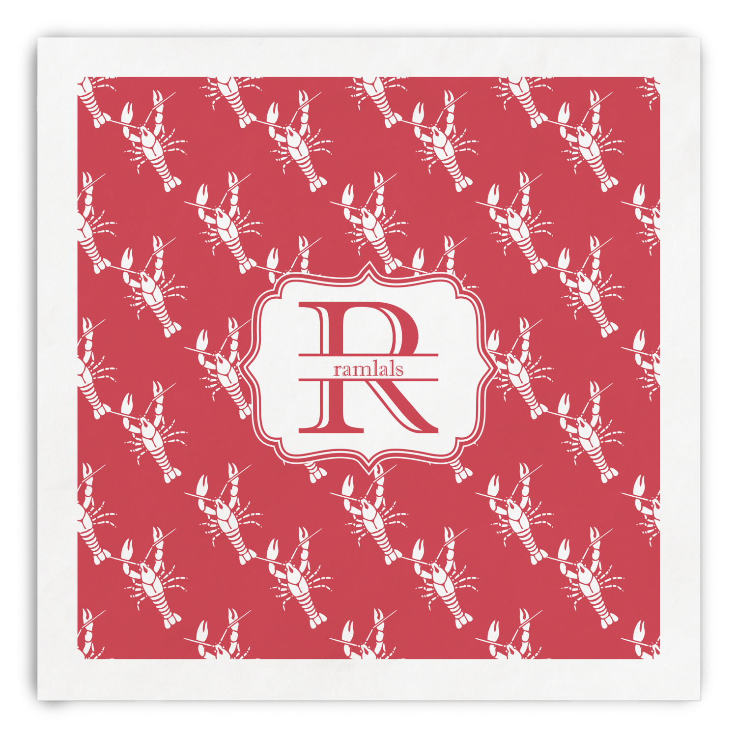 The design is done is a red background with white crawfish, while the personalization is inside a beautiful decorative rectangular frame. The personalization style is an initial along with the name.