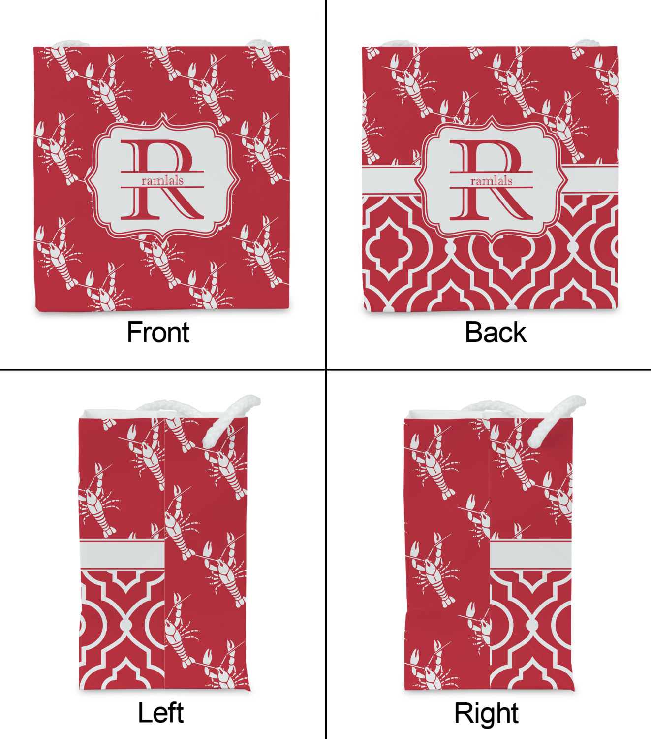 The design is done is a red background with white crawfish, while the personalization is inside a beautiful decorative rectangular frame. The personalization style is an initial along with the name.