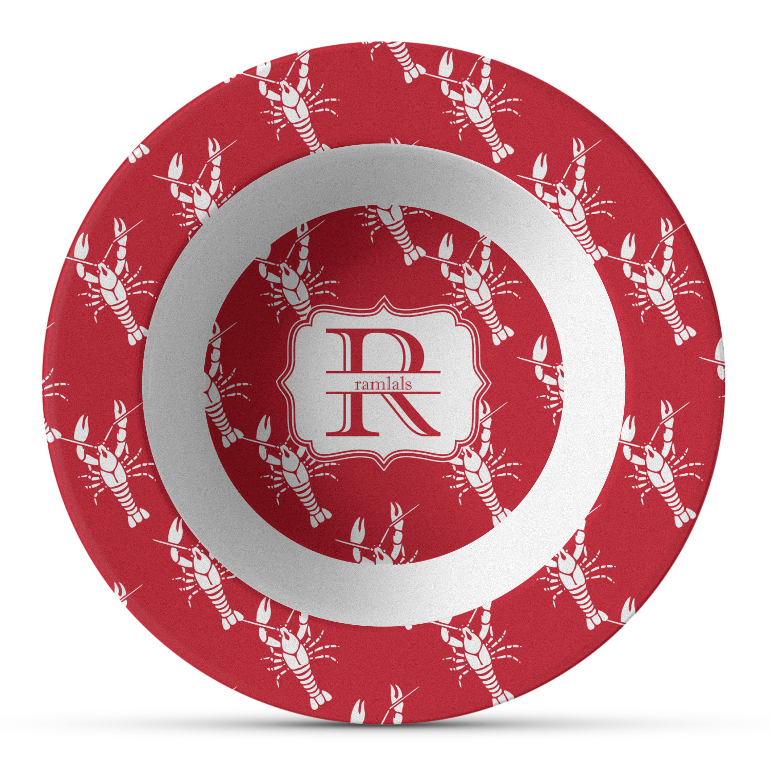 The design is done is a red background with white crawfish, while the personalization is inside a beautiful decorative rectangular frame. The personalization style is an initial along with the name.