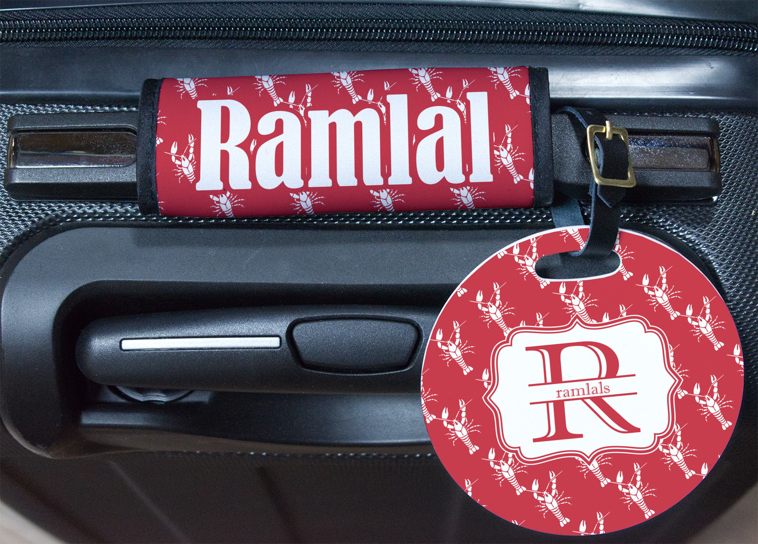 The design is done is a red background with white crawfish, while the personalization is inside a beautiful decorative rectangular frame. The personalization style is an initial along with the name.