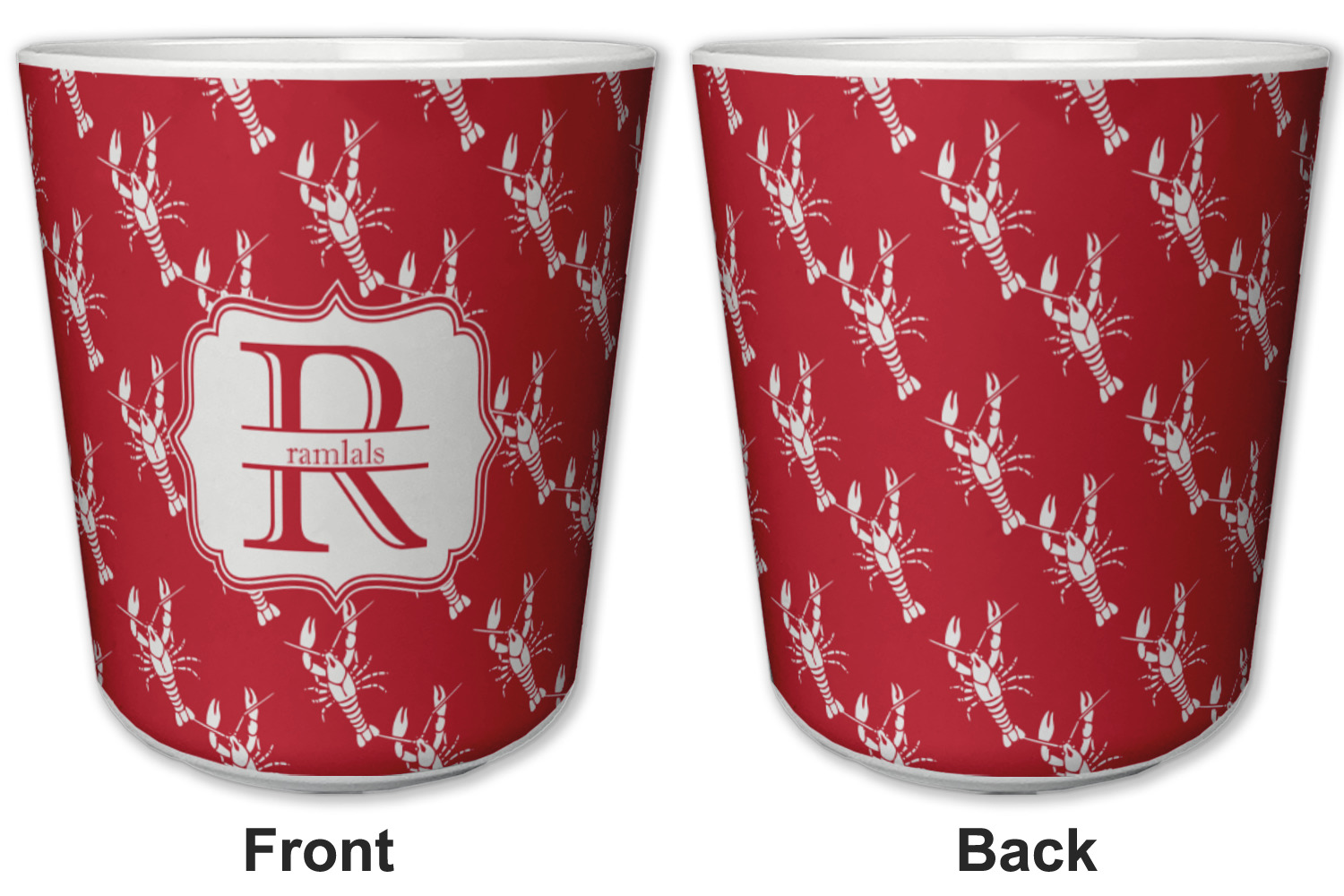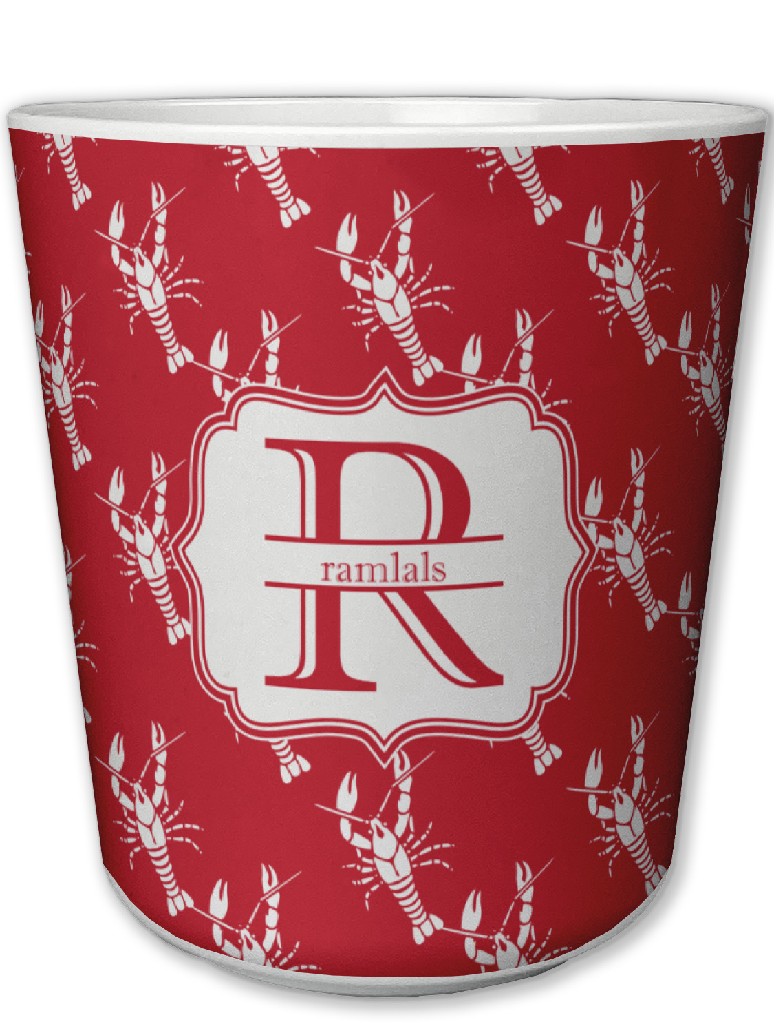 The design is done is a red background with white crawfish, while the personalization is inside a beautiful decorative rectangular frame. The personalization style is an initial along with the name.