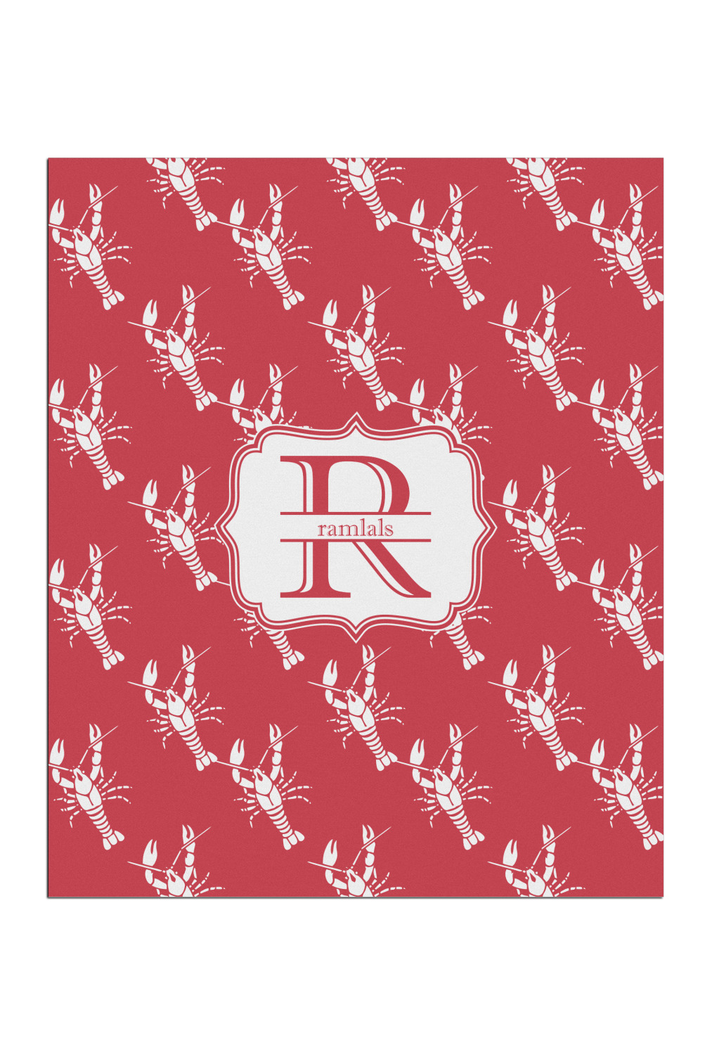 The design is done is a red background with white crawfish, while the personalization is inside a beautiful decorative rectangular frame. The personalization style is an initial along with the name.