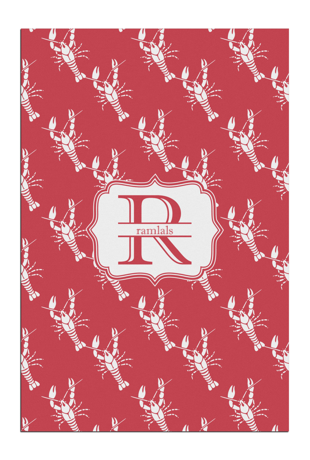 The design is done is a red background with white crawfish, while the personalization is inside a beautiful decorative rectangular frame. The personalization style is an initial along with the name.