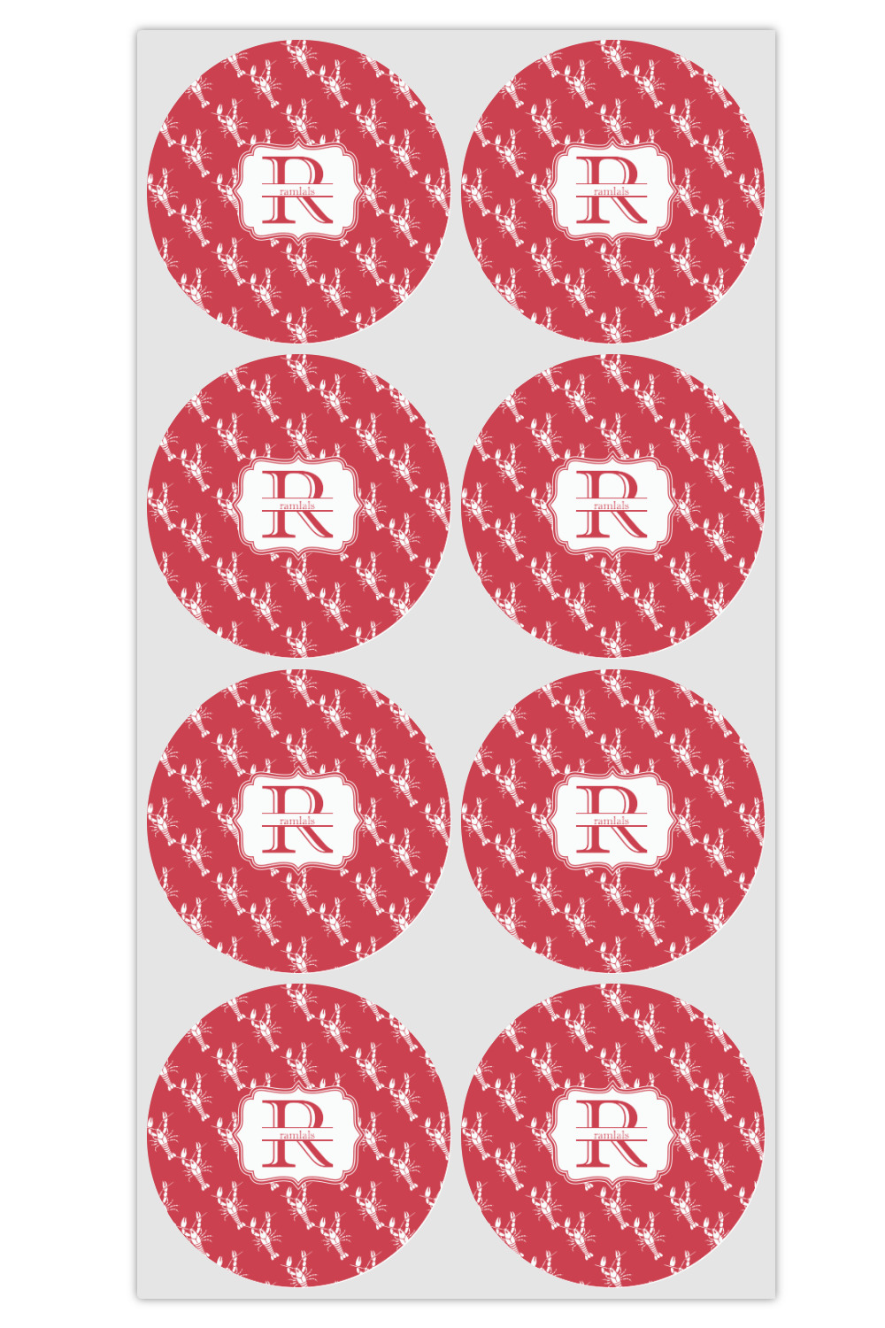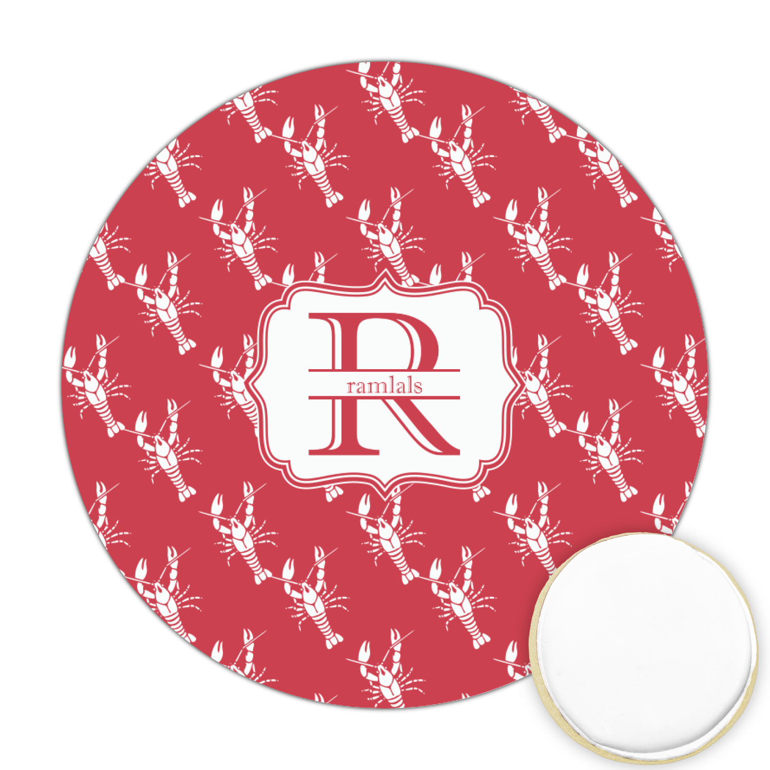 The design is done is a red background with white crawfish, while the personalization is inside a beautiful decorative rectangular frame. The personalization style is an initial along with the name.