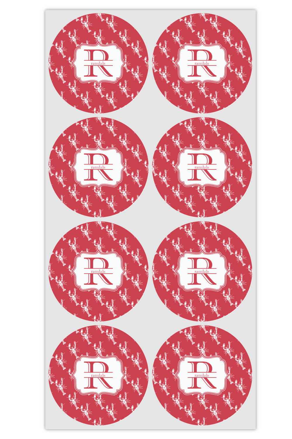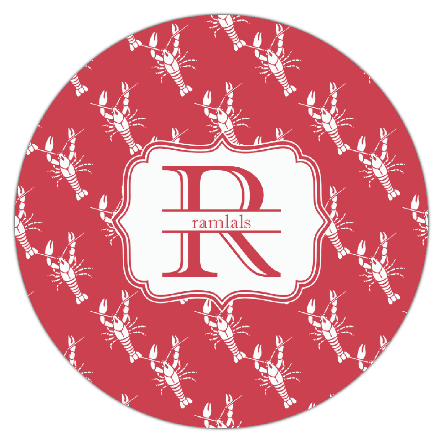 The design is done is a red background with white crawfish, while the personalization is inside a beautiful decorative rectangular frame. The personalization style is an initial along with the name.