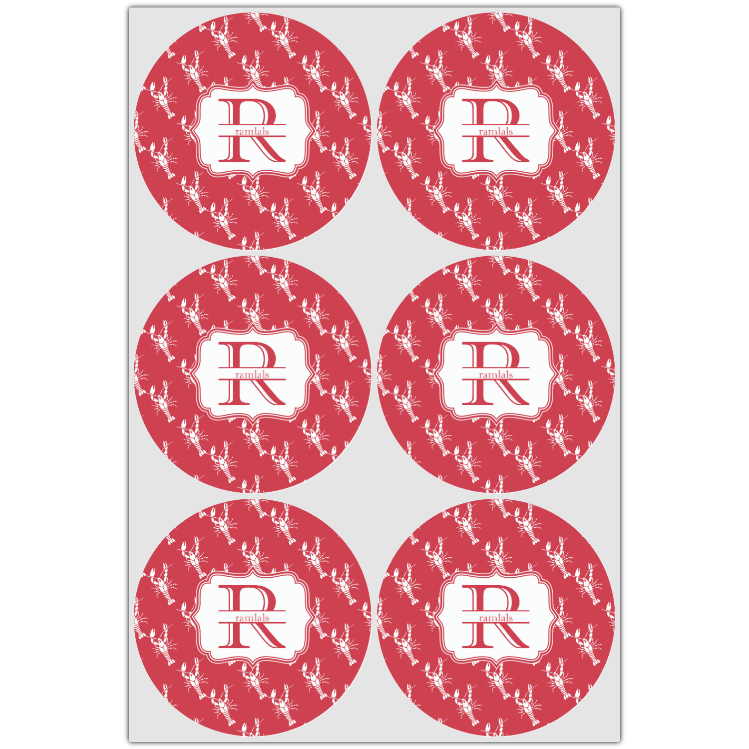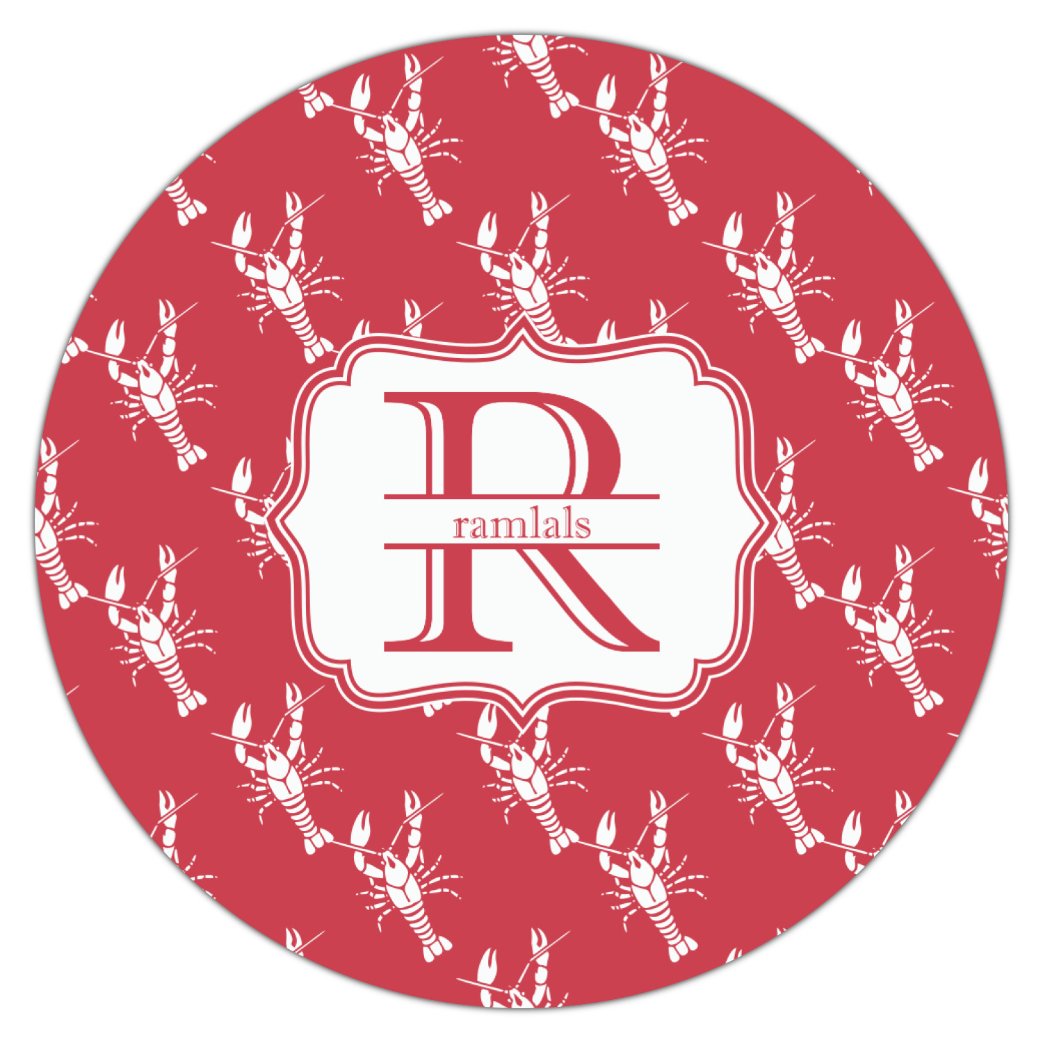 The design is done is a red background with white crawfish, while the personalization is inside a beautiful decorative rectangular frame. The personalization style is an initial along with the name.