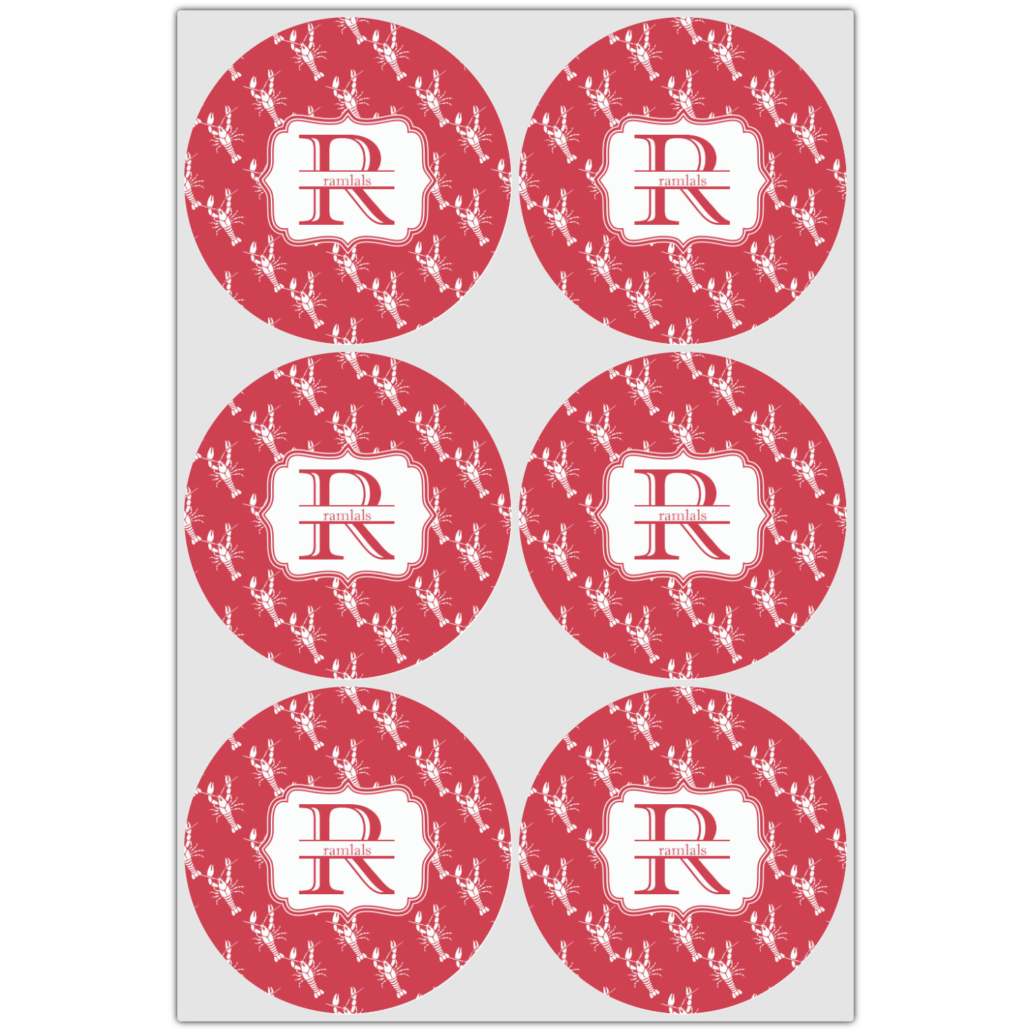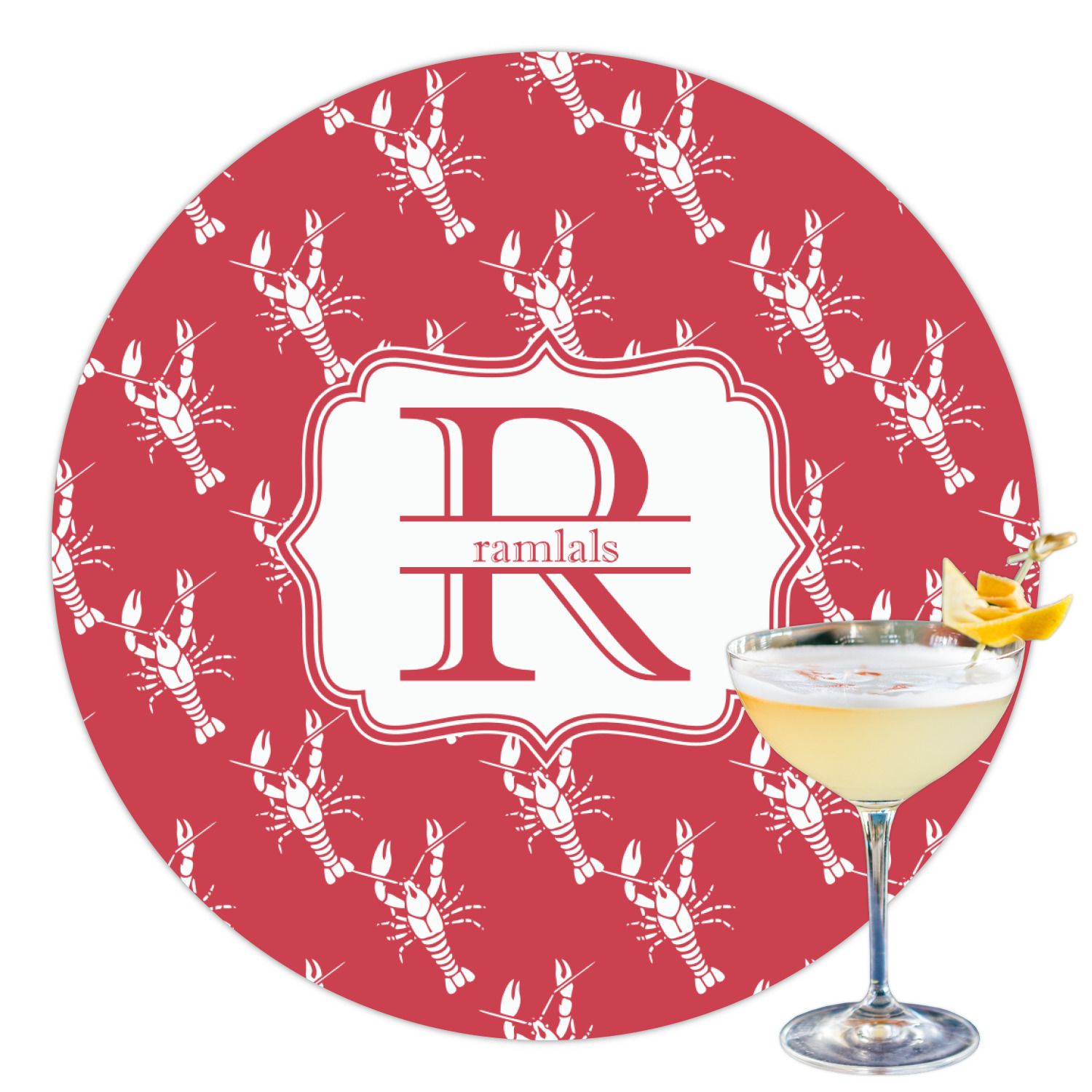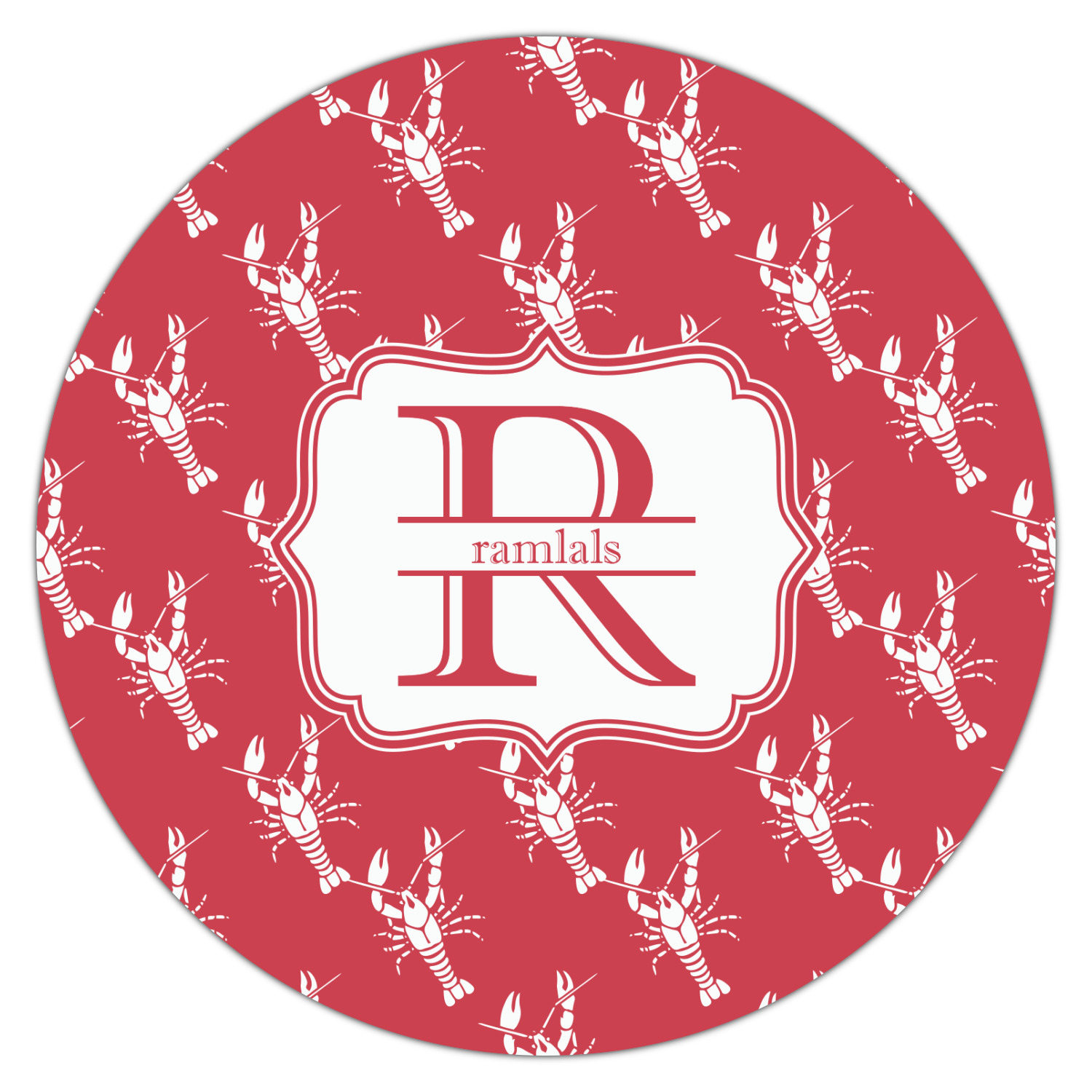 The design is done is a red background with white crawfish, while the personalization is inside a beautiful decorative rectangular frame. The personalization style is an initial along with the name.