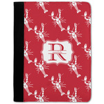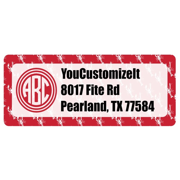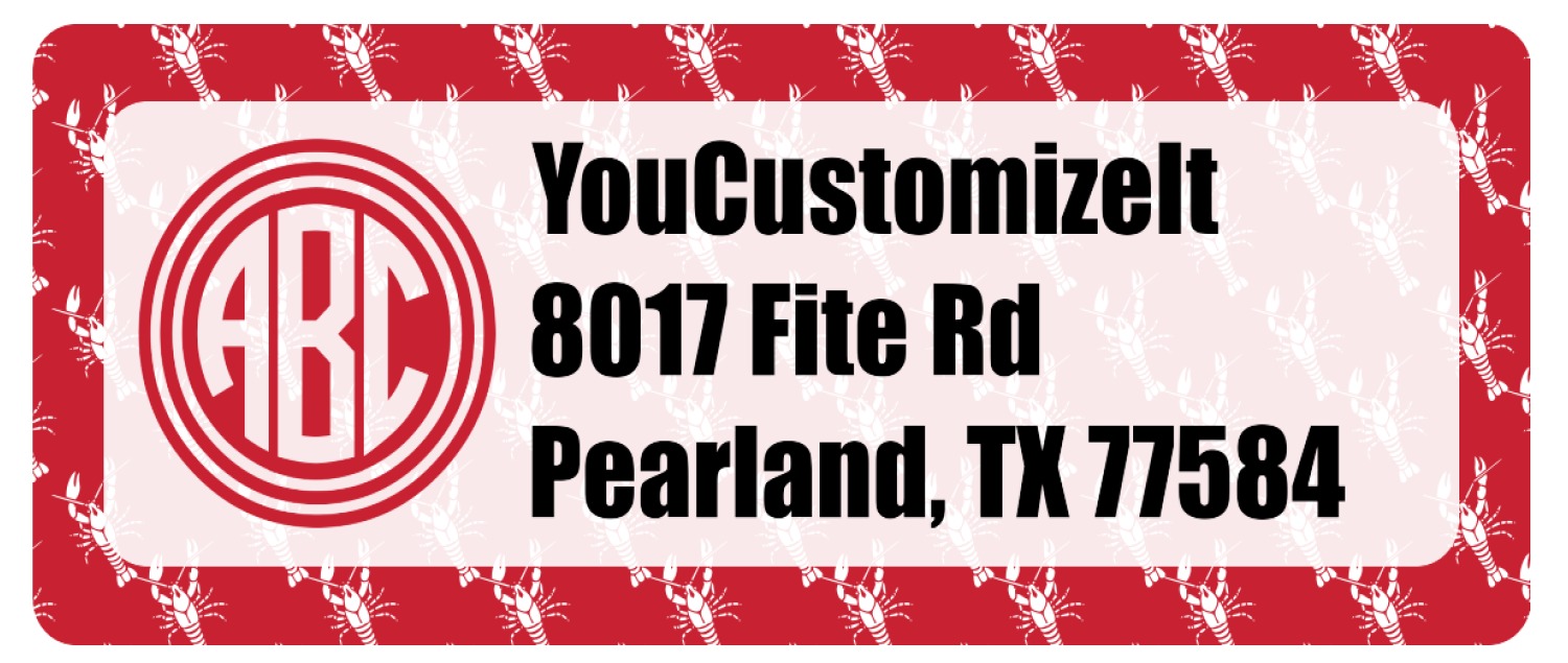 The design is done is a red background with white crawfish, while the personalization is inside a beautiful decorative rectangular frame. The personalization style is an initial along with the name.