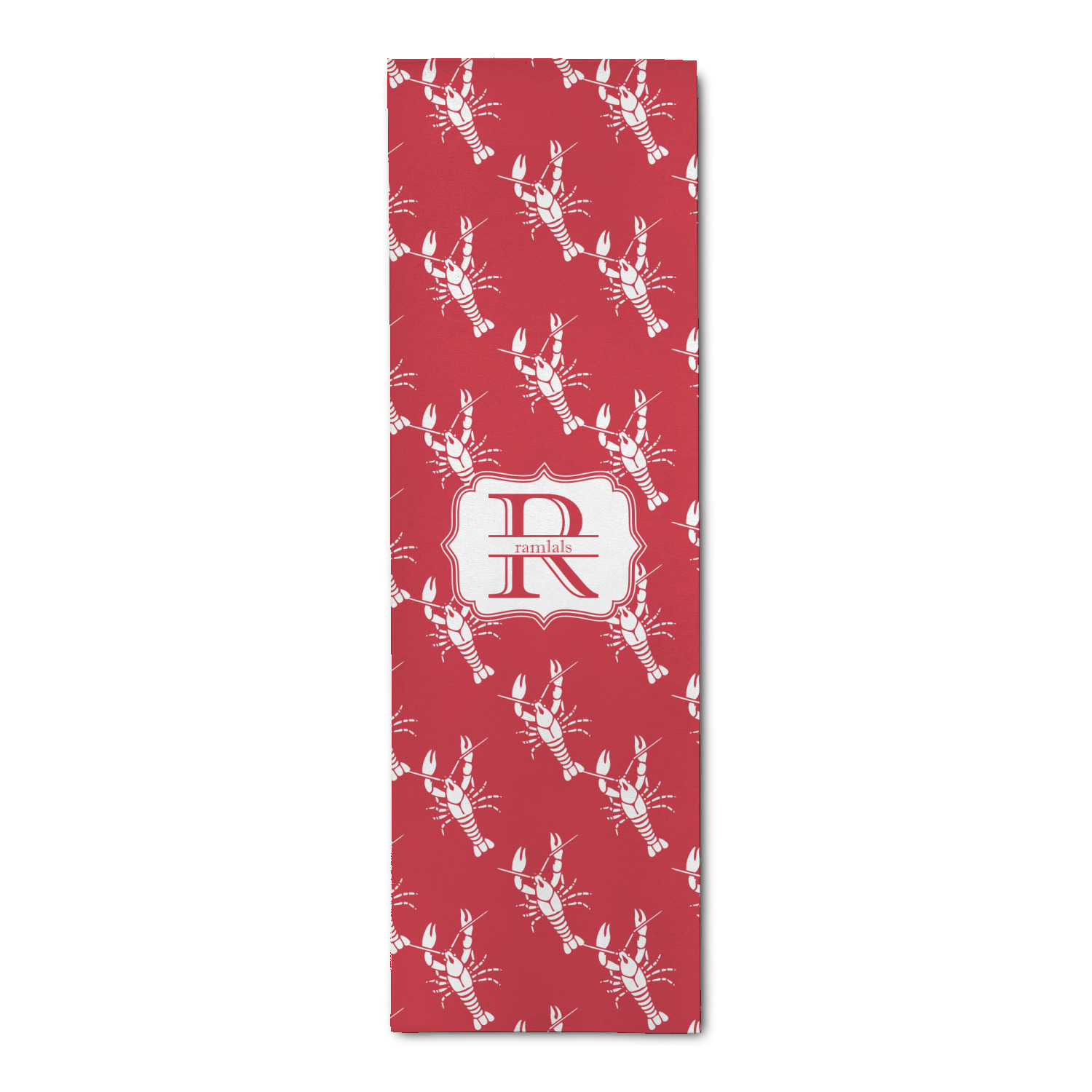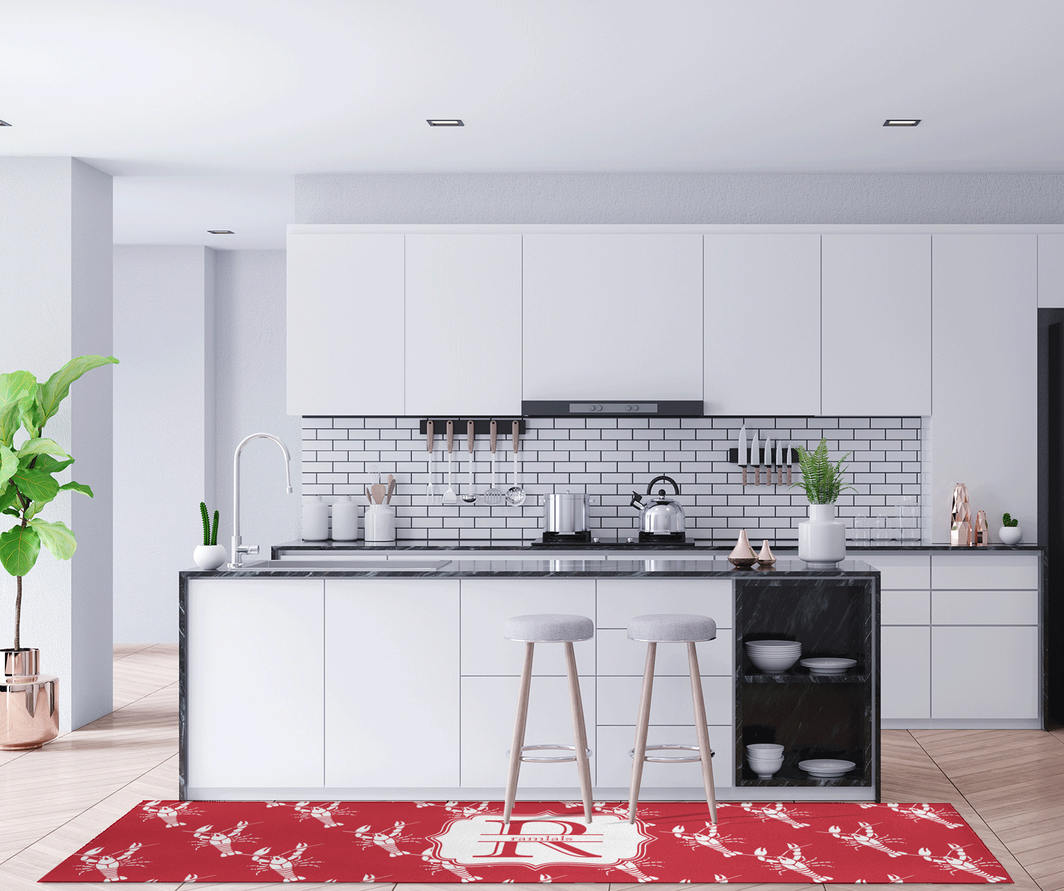 The design is done is a red background with white crawfish, while the personalization is inside a beautiful decorative rectangular frame. The personalization style is an initial along with the name.
