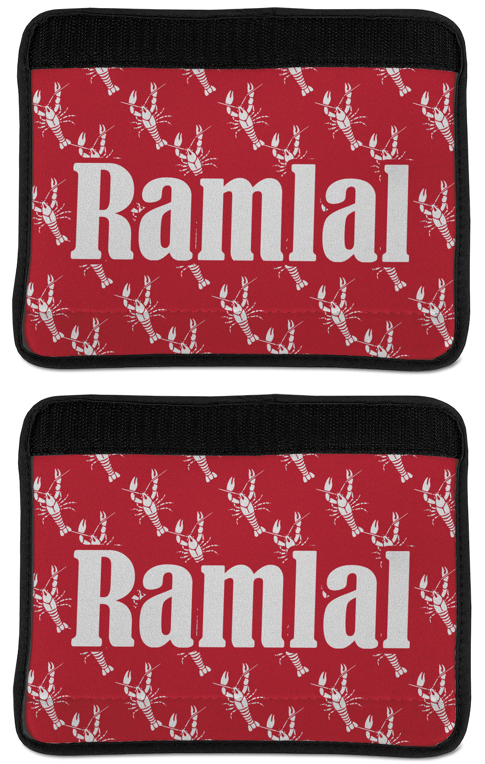 The design is done is a red background with white crawfish, while the personalization is inside a beautiful decorative rectangular frame. The personalization style is an initial along with the name.