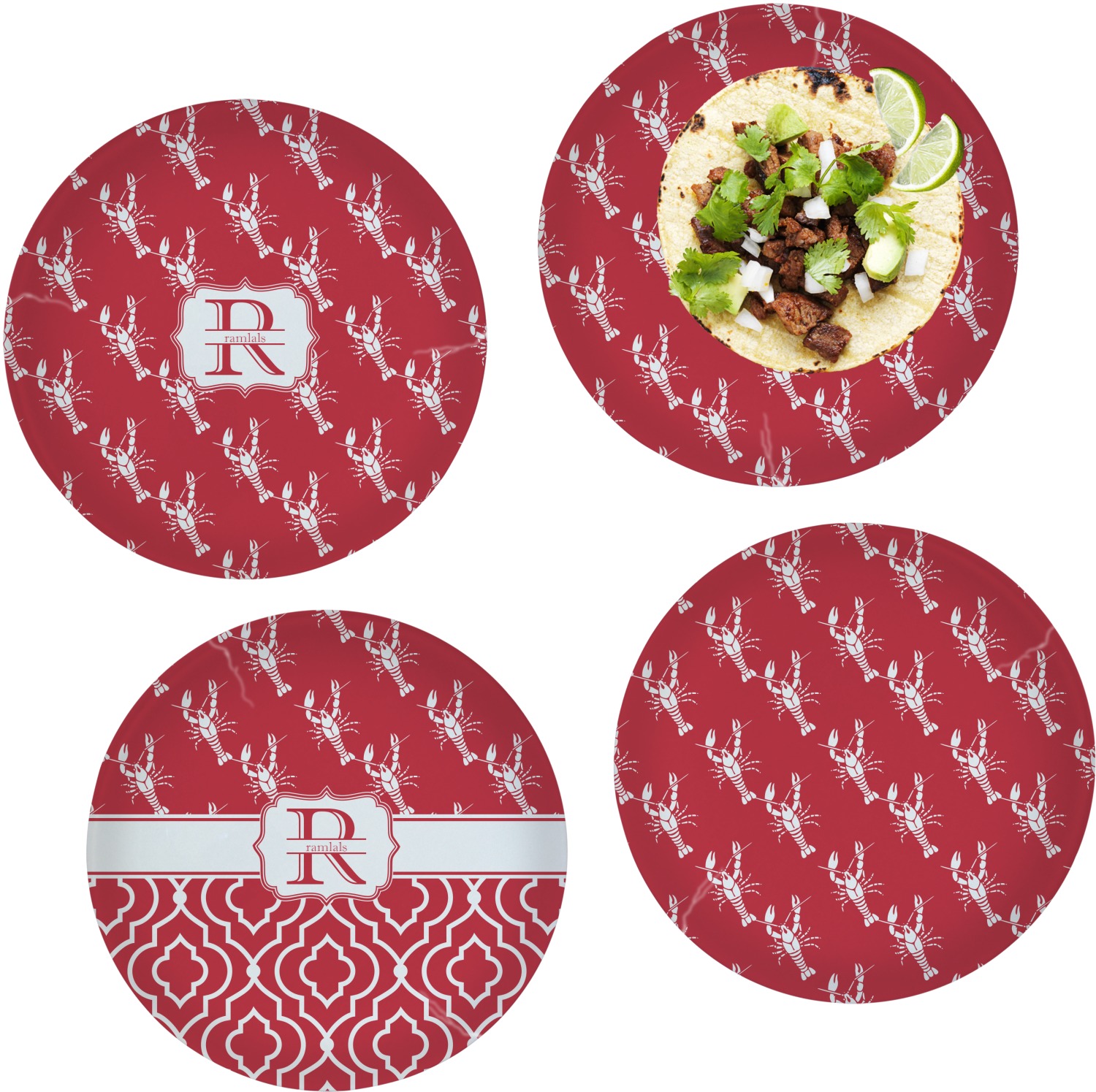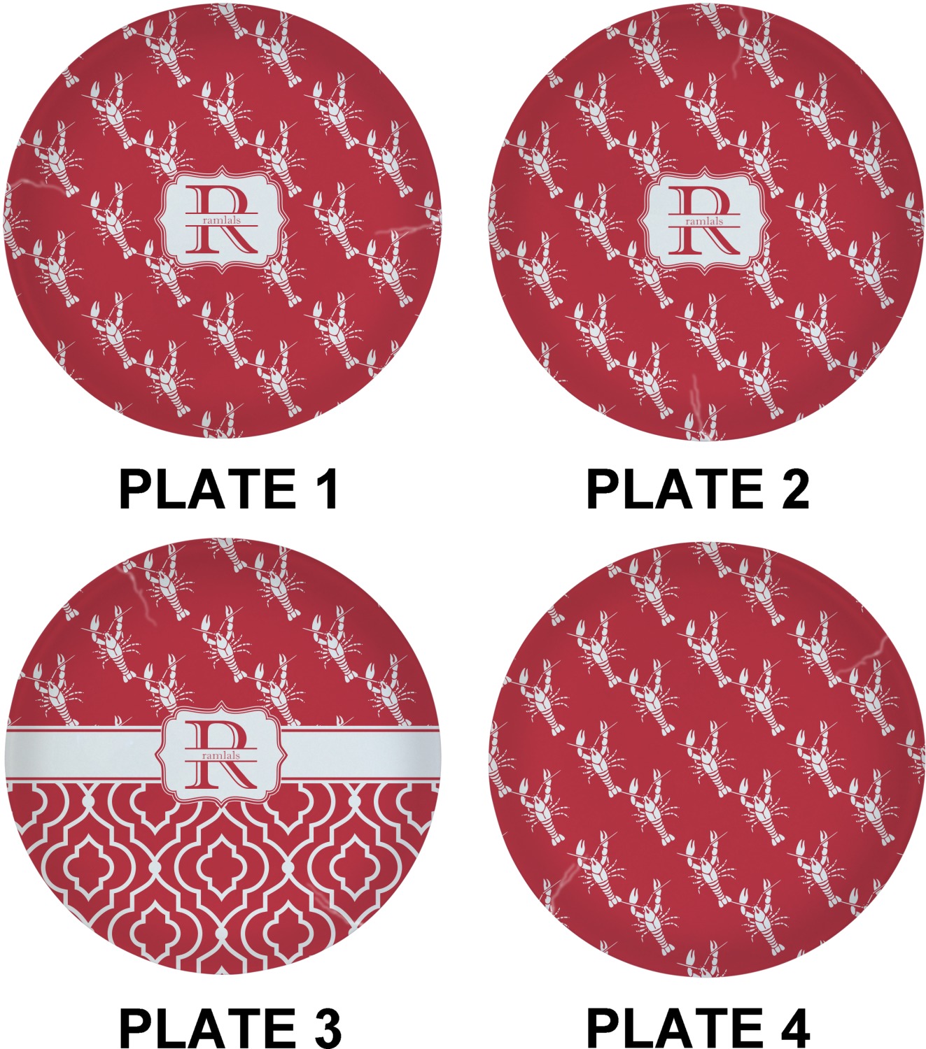 The design is done is a red background with white crawfish, while the personalization is inside a beautiful decorative rectangular frame. The personalization style is an initial along with the name.