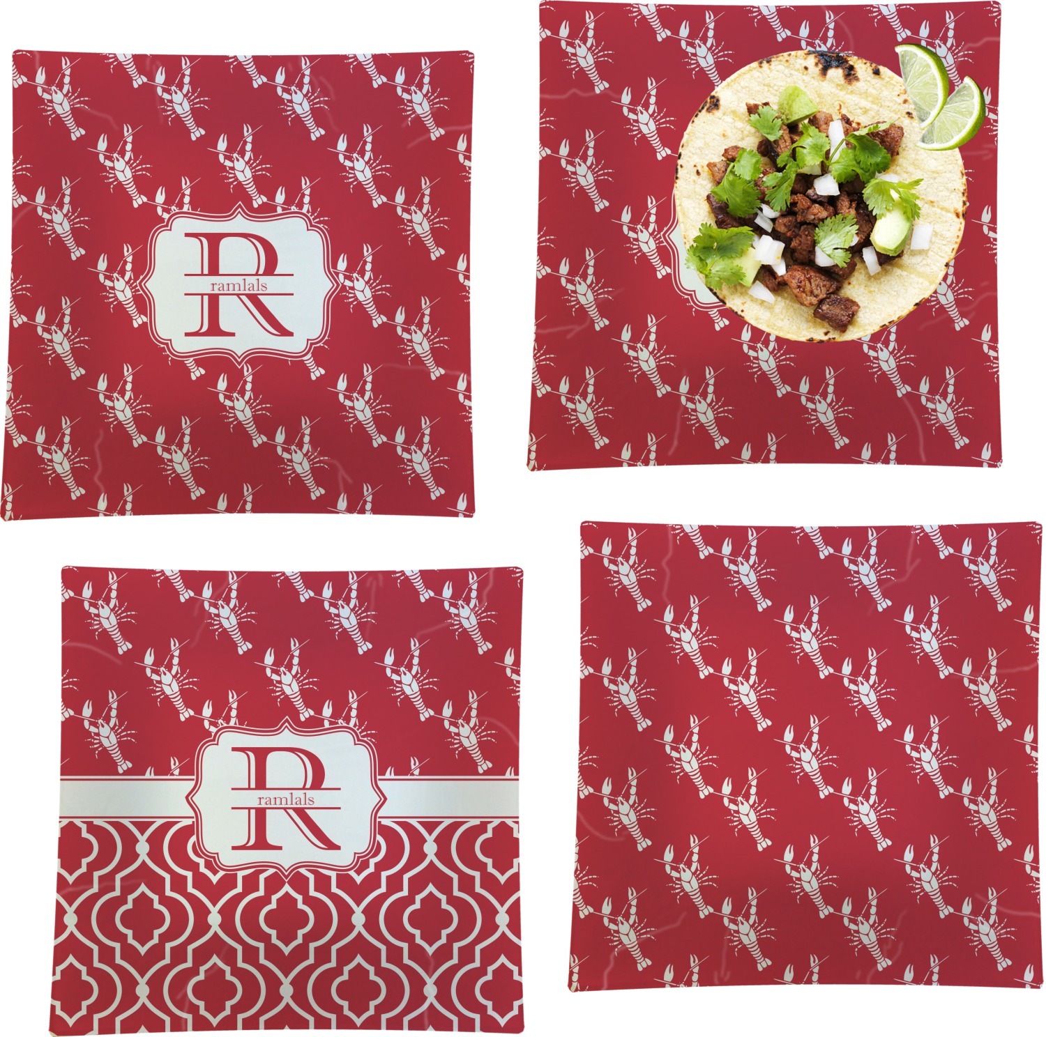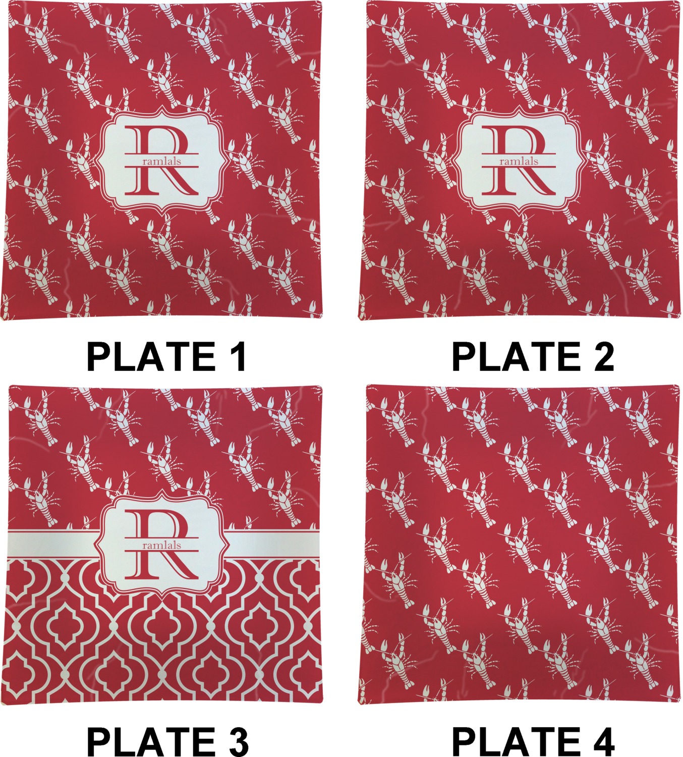 The design is done is a red background with white crawfish, while the personalization is inside a beautiful decorative rectangular frame. The personalization style is an initial along with the name.