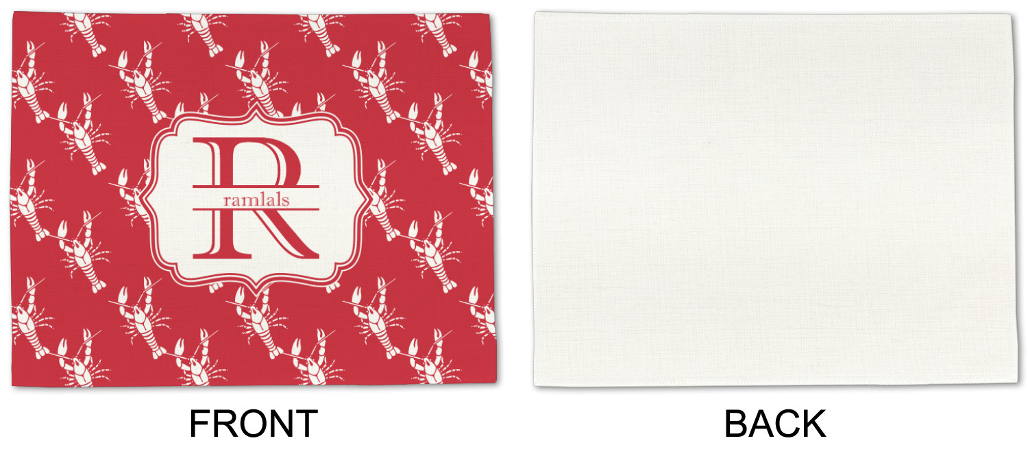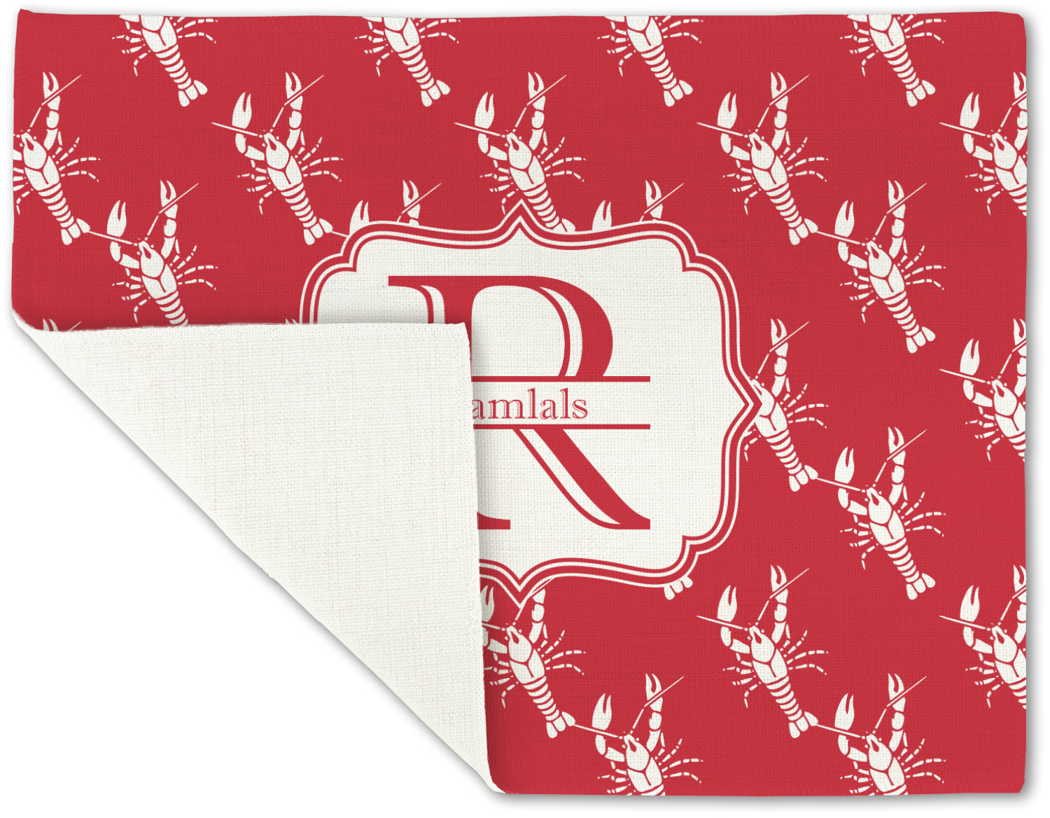 The design is done is a red background with white crawfish, while the personalization is inside a beautiful decorative rectangular frame. The personalization style is an initial along with the name.