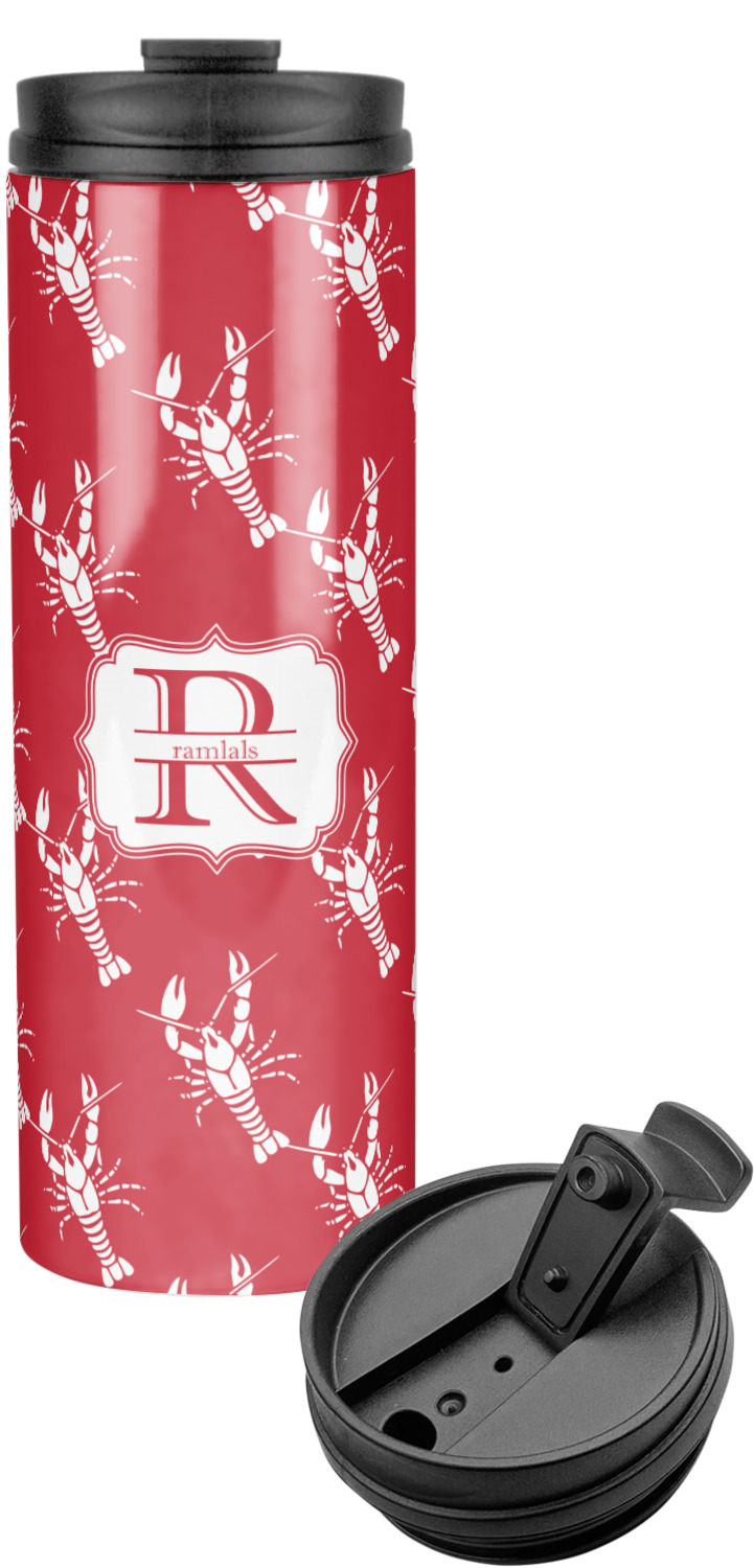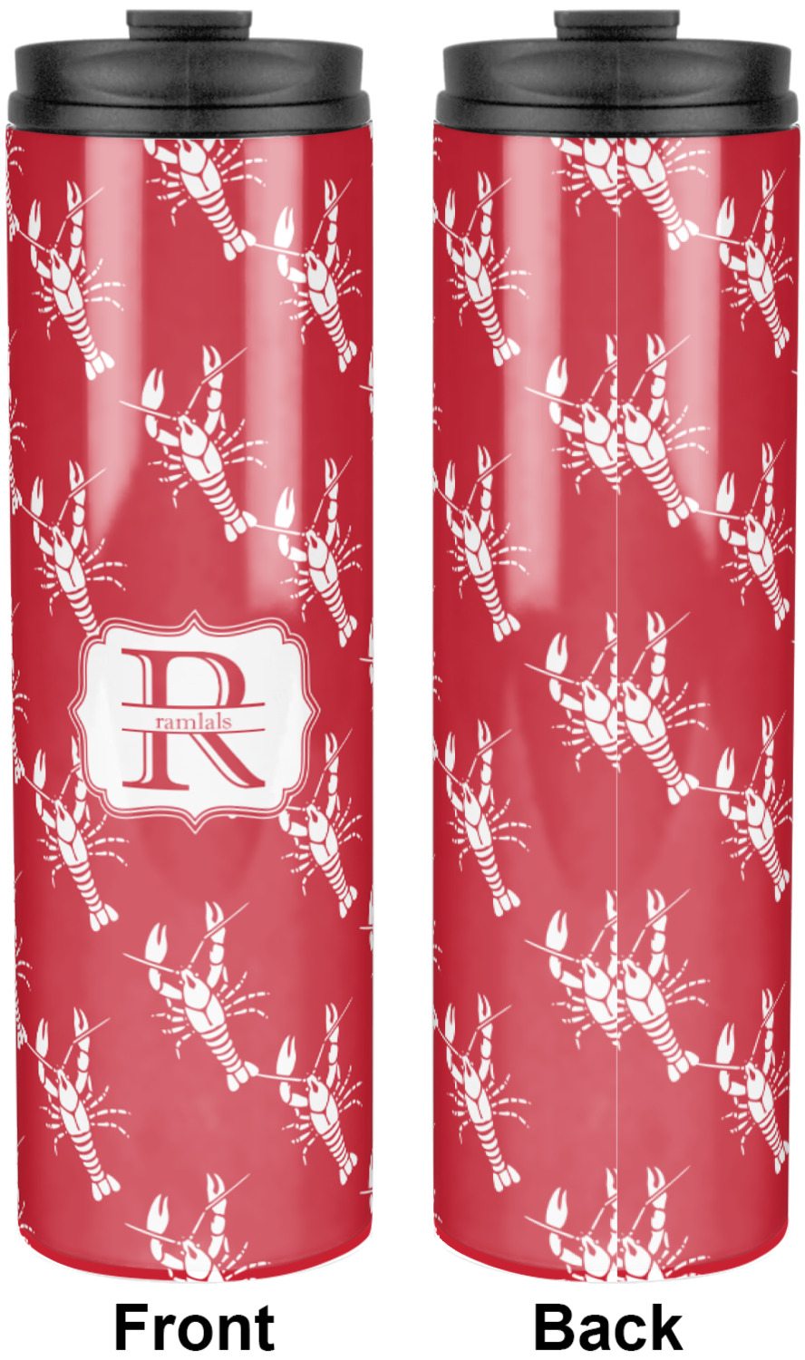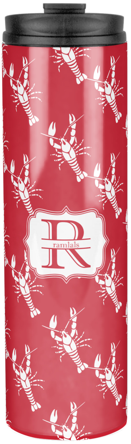 The design is done is a red background with white crawfish, while the personalization is inside a beautiful decorative rectangular frame. The personalization style is an initial along with the name.