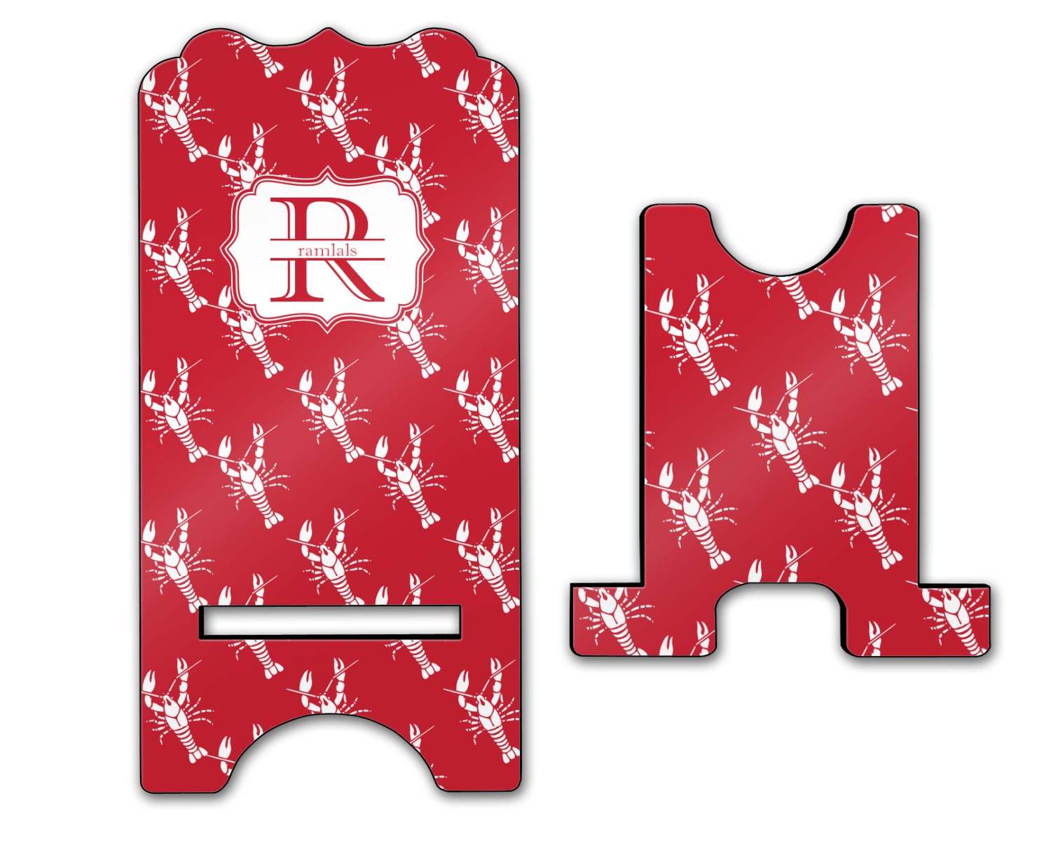 The design is done is a red background with white crawfish, while the personalization is inside a beautiful decorative rectangular frame. The personalization style is an initial along with the name.