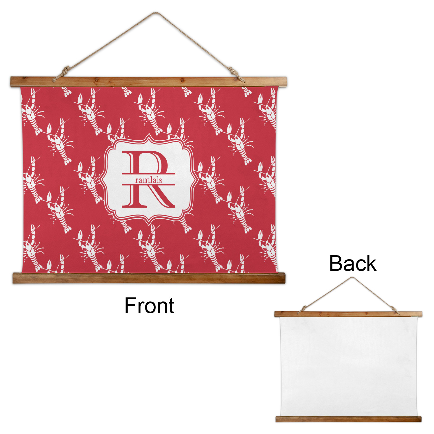 The design is done is a red background with white crawfish, while the personalization is inside a beautiful decorative rectangular frame. The personalization style is an initial along with the name.