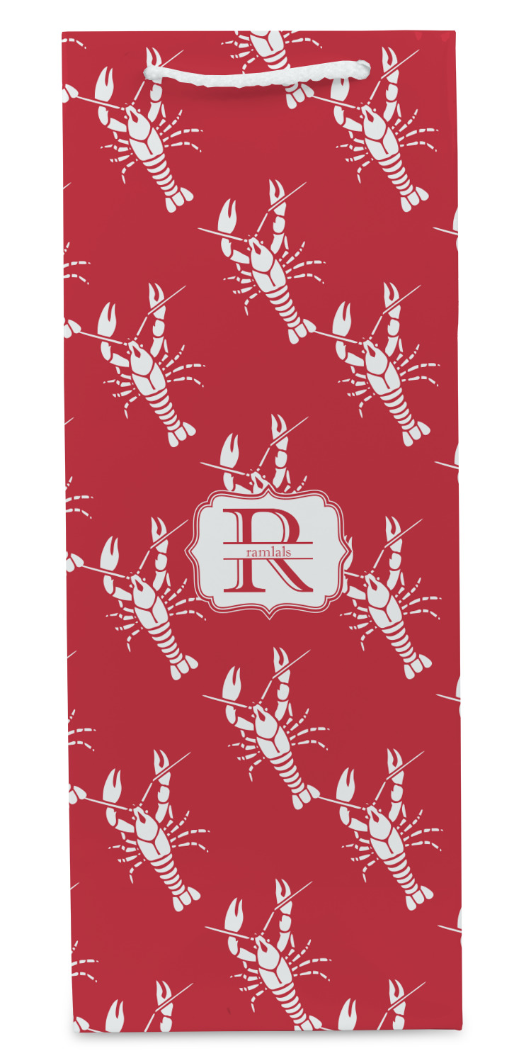 The design is done is a red background with white crawfish, while the personalization is inside a beautiful decorative rectangular frame. The personalization style is an initial along with the name.