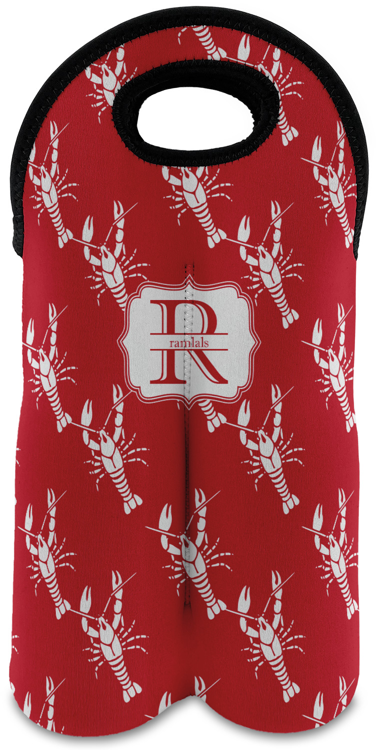 The design is done is a red background with white crawfish, while the personalization is inside a beautiful decorative rectangular frame. The personalization style is an initial along with the name.
