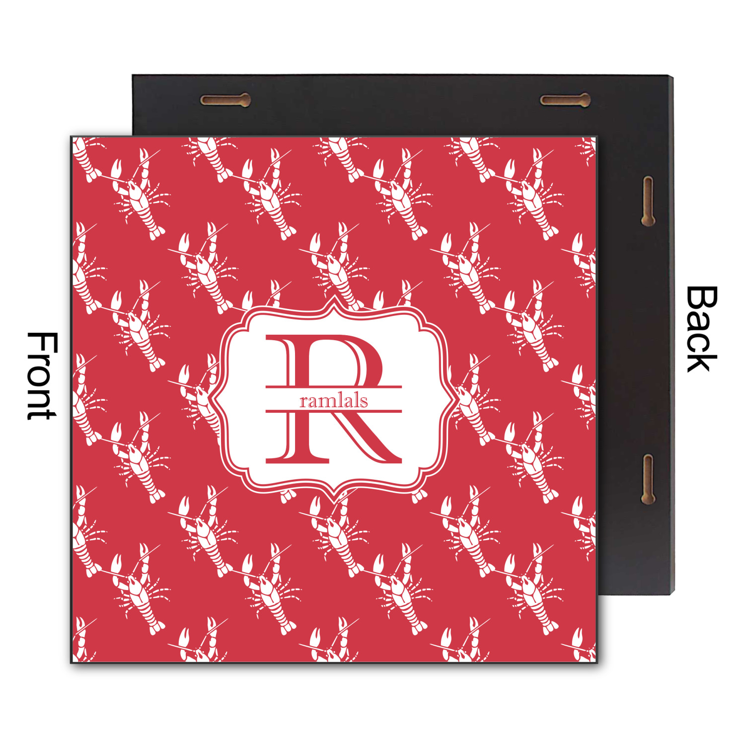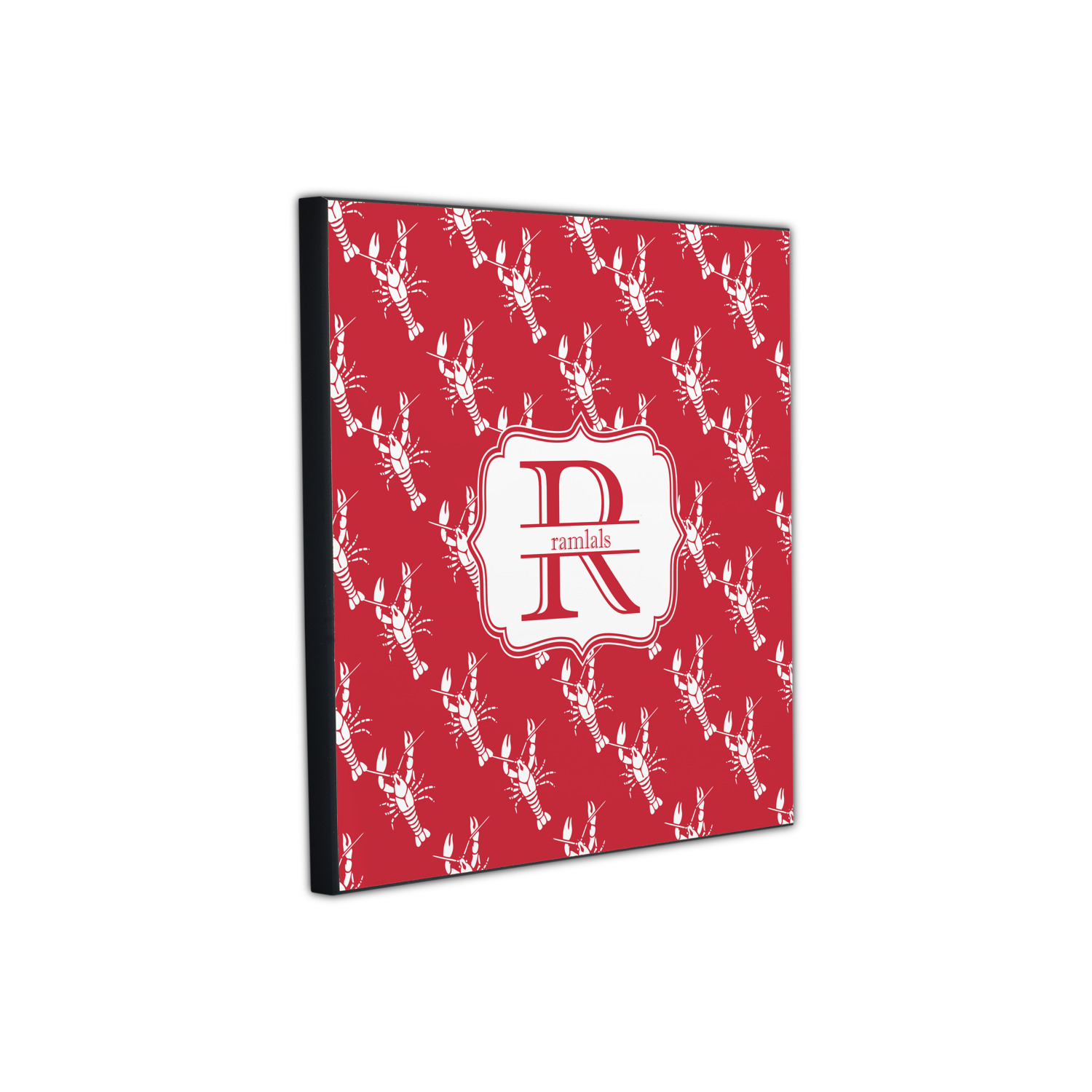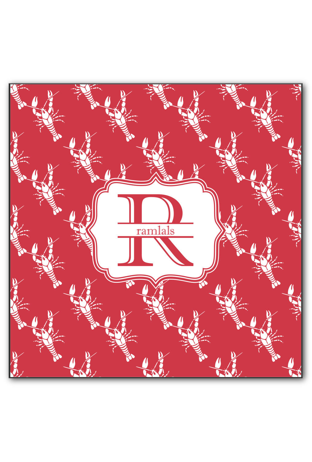 The design is done is a red background with white crawfish, while the personalization is inside a beautiful decorative rectangular frame. The personalization style is an initial along with the name.