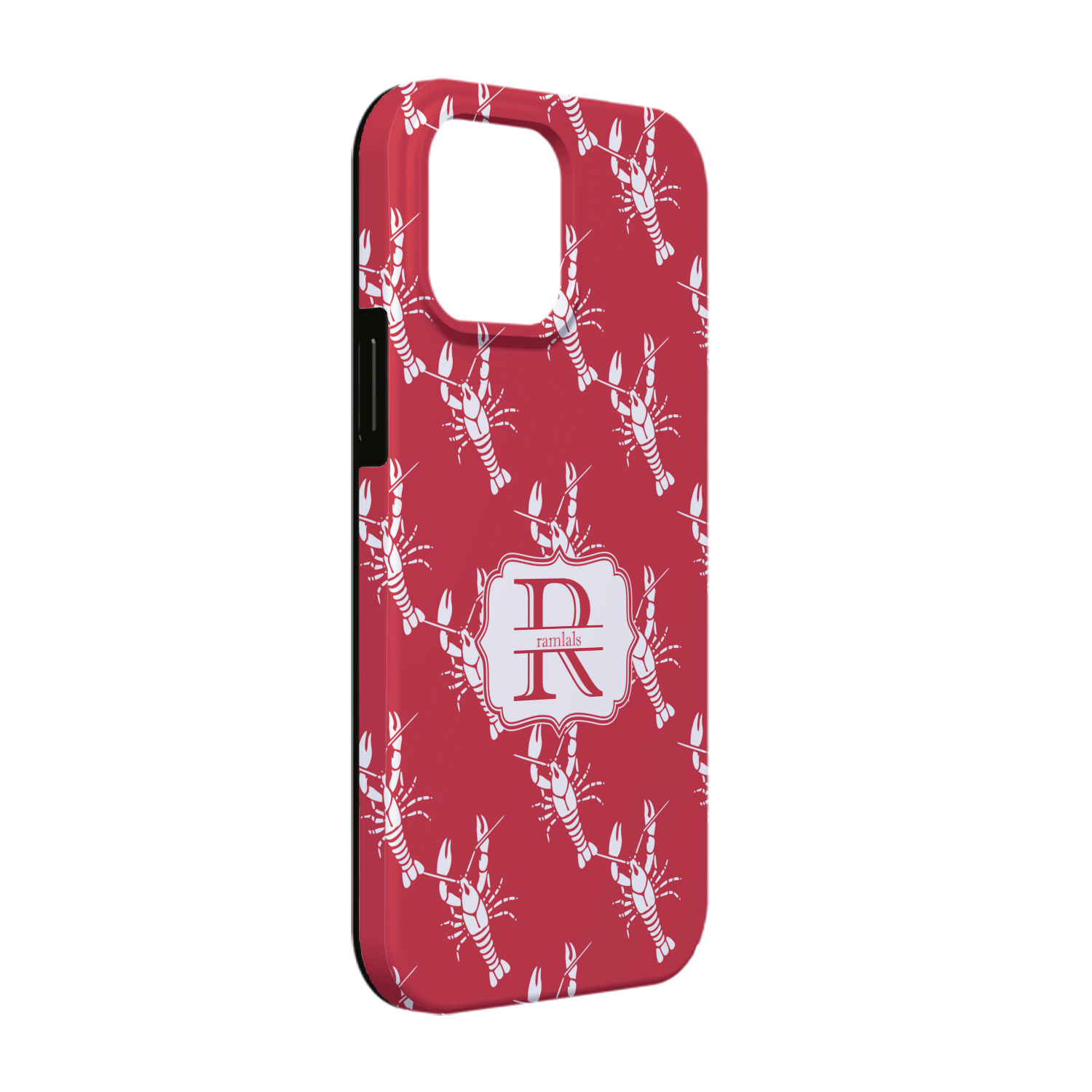 The design is done is a red background with white crawfish, while the personalization is inside a beautiful decorative rectangular frame. The personalization style is an initial along with the name.