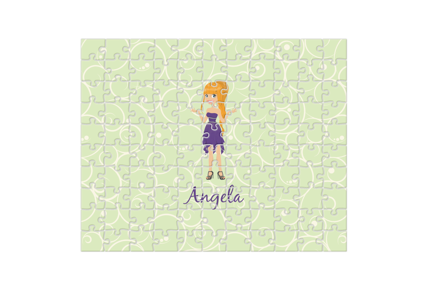 This design was built with a swirls background in a light green and cream color. We chose woman 1 wearing dress 3 and gave her blond hair, light skin, blue eyes, a purple dress and silver shoes. We personalized the design with her name.