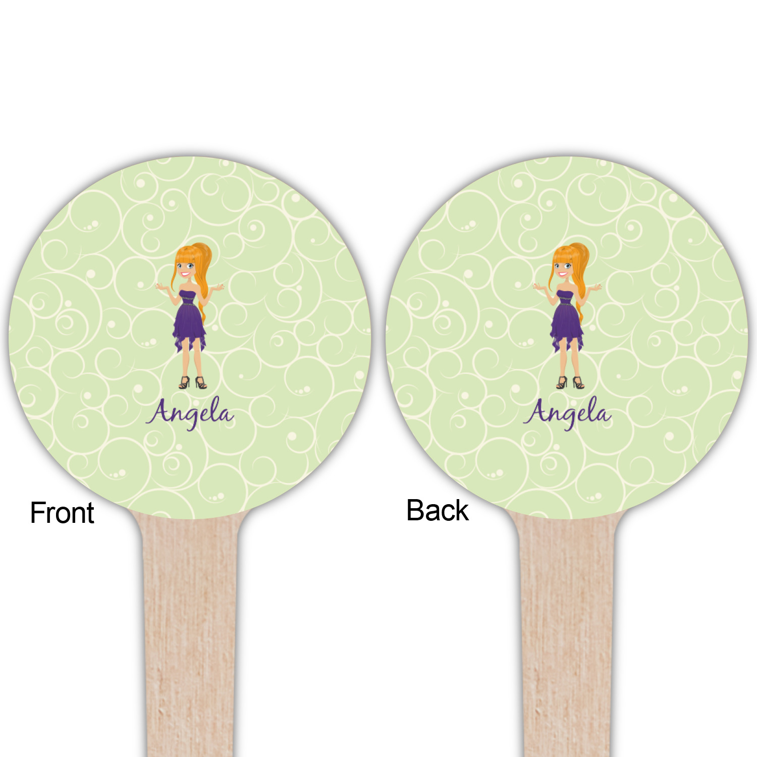 This design was built with a swirls background in a light green and cream color. We chose woman 1 wearing dress 3 and gave her blond hair, light skin, blue eyes, a purple dress and silver shoes. We personalized the design with her name.