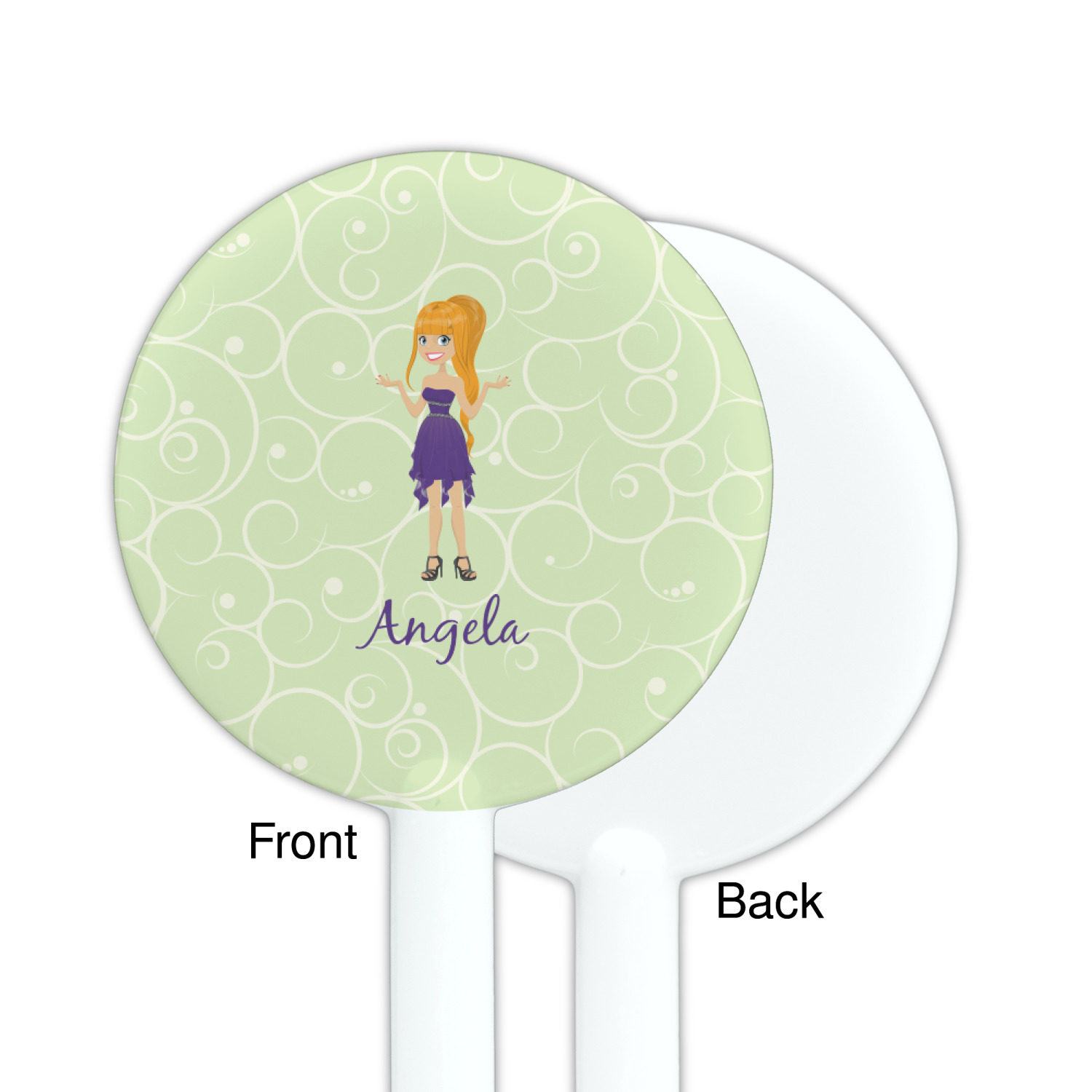 This design was built with a swirls background in a light green and cream color. We chose woman 1 wearing dress 3 and gave her blond hair, light skin, blue eyes, a purple dress and silver shoes. We personalized the design with her name.