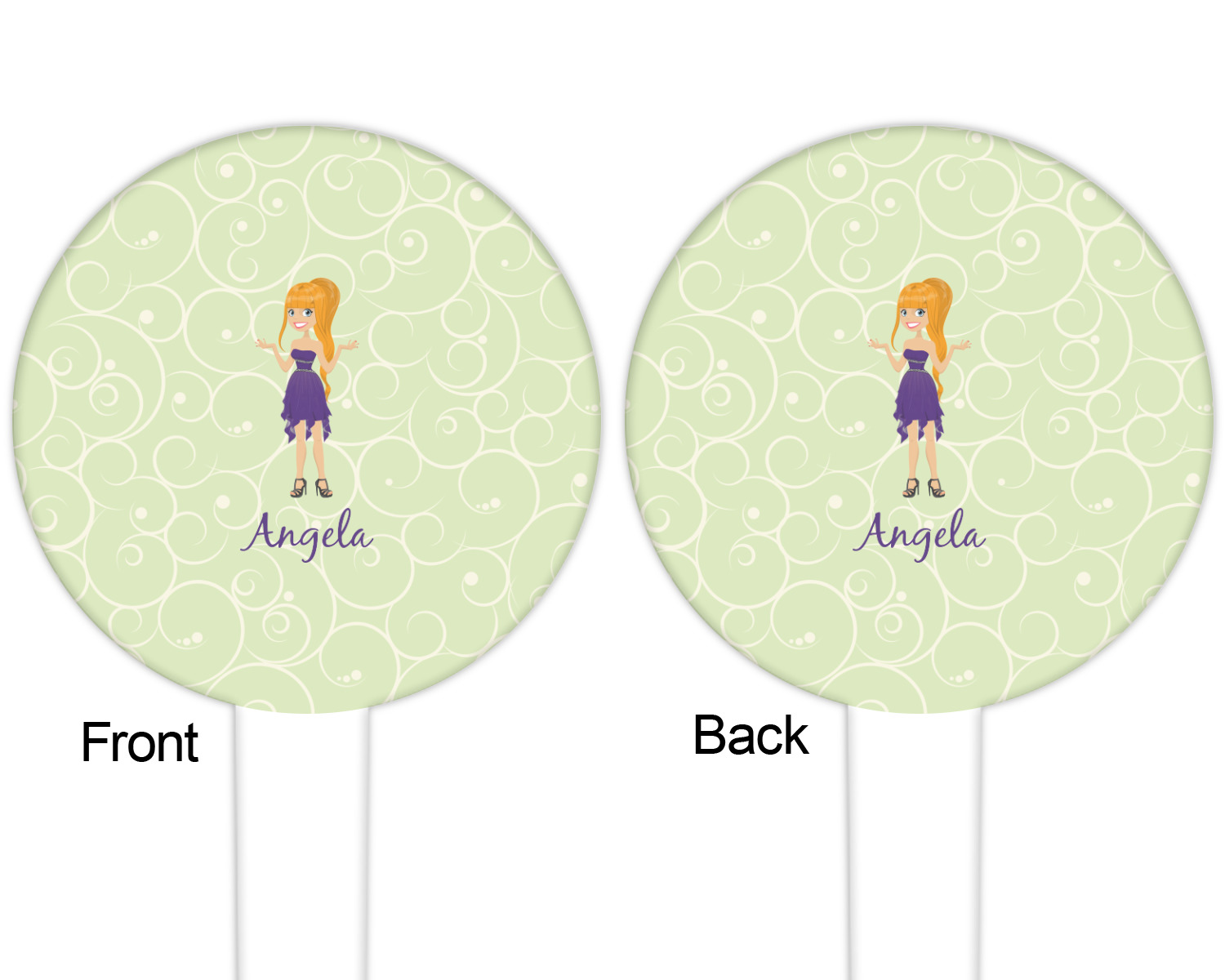 This design was built with a swirls background in a light green and cream color. We chose woman 1 wearing dress 3 and gave her blond hair, light skin, blue eyes, a purple dress and silver shoes. We personalized the design with her name.
