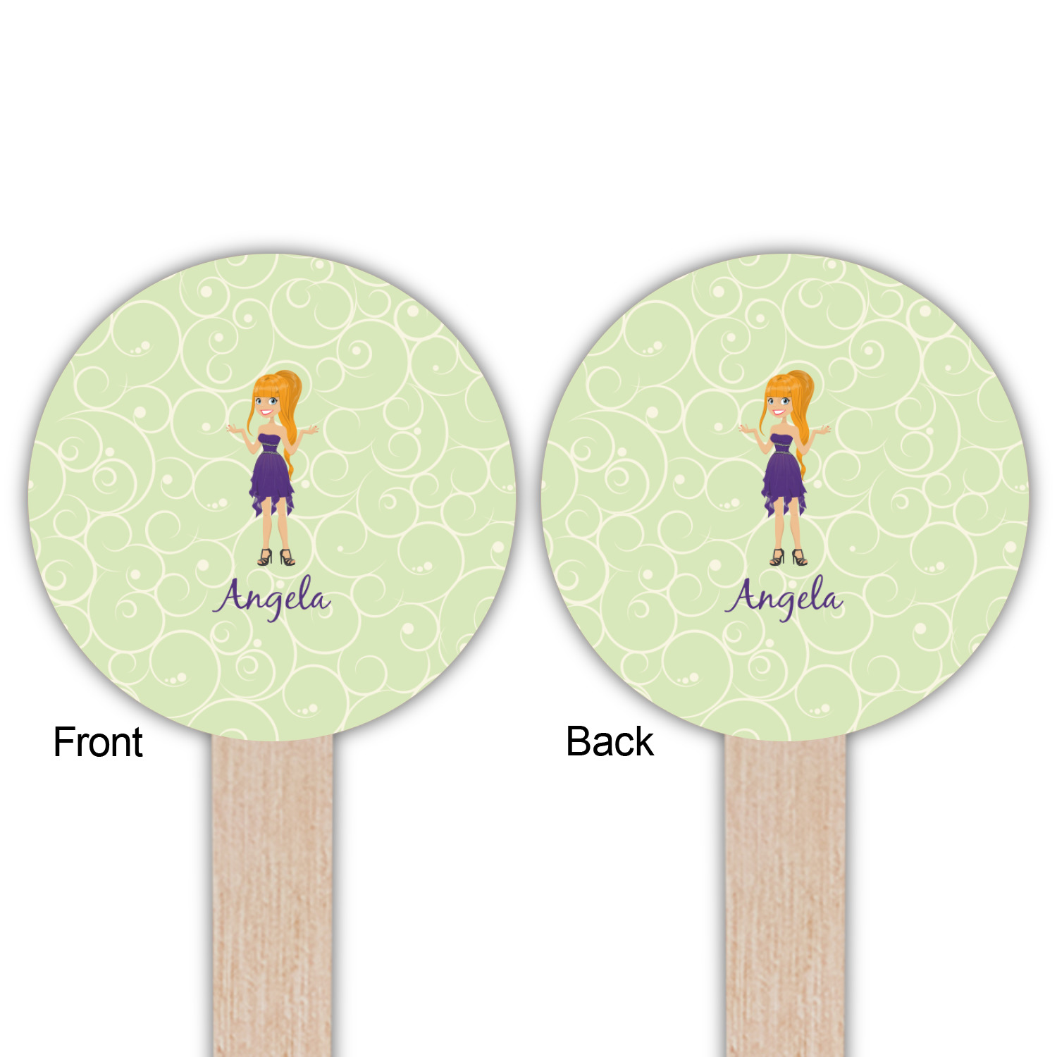 This design was built with a swirls background in a light green and cream color. We chose woman 1 wearing dress 3 and gave her blond hair, light skin, blue eyes, a purple dress and silver shoes. We personalized the design with her name.