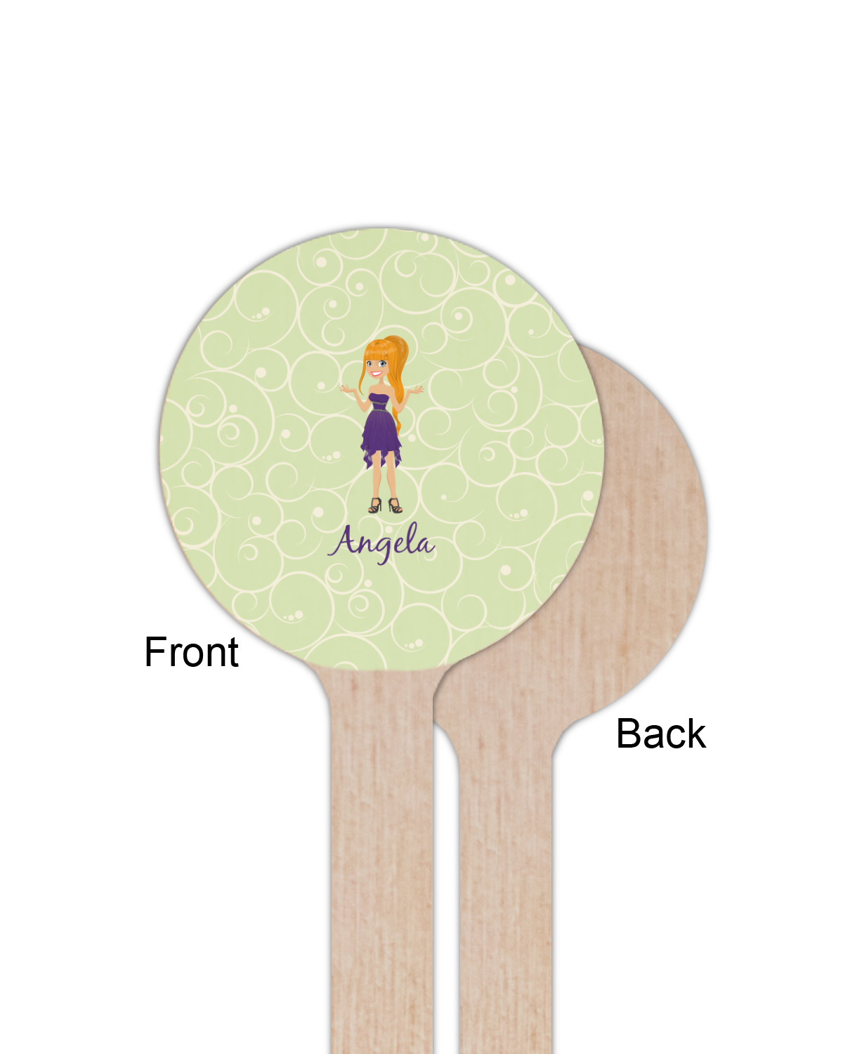 This design was built with a swirls background in a light green and cream color. We chose woman 1 wearing dress 3 and gave her blond hair, light skin, blue eyes, a purple dress and silver shoes. We personalized the design with her name.