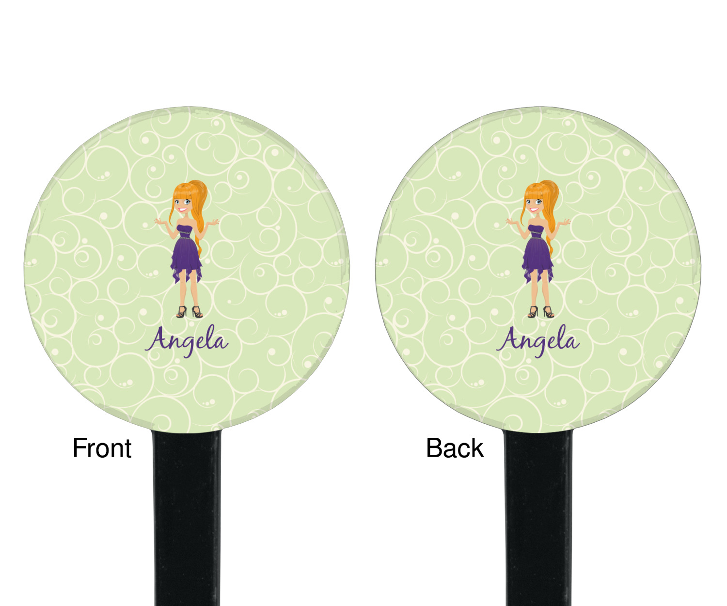 This design was built with a swirls background in a light green and cream color. We chose woman 1 wearing dress 3 and gave her blond hair, light skin, blue eyes, a purple dress and silver shoes. We personalized the design with her name.