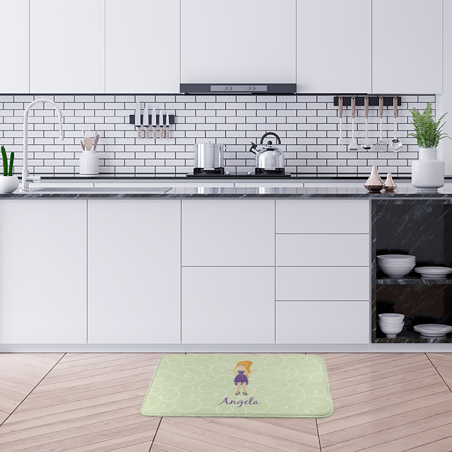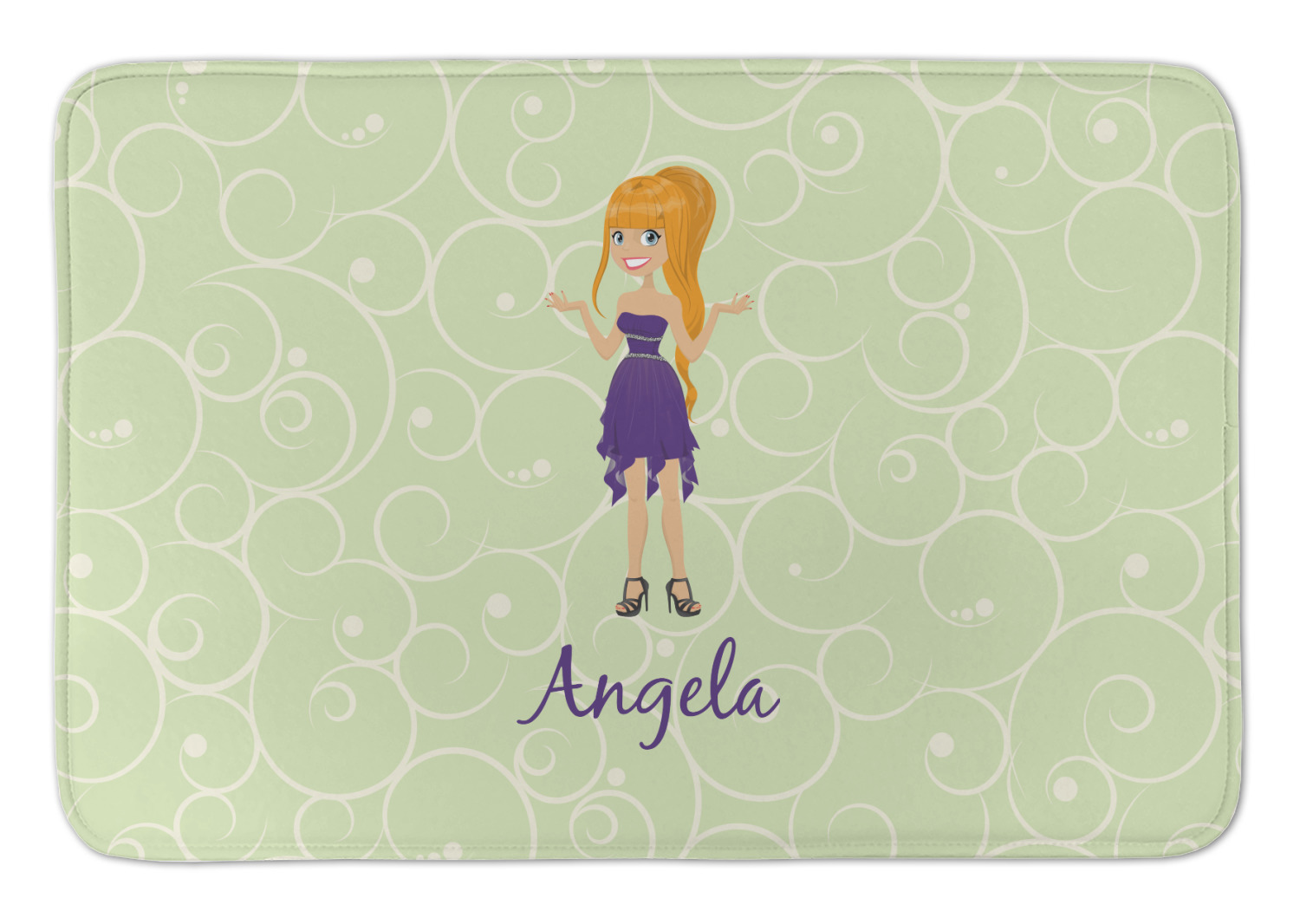 This design was built with a swirls background in a light green and cream color. We chose woman 1 wearing dress 3 and gave her blond hair, light skin, blue eyes, a purple dress and silver shoes. We personalized the design with her name.