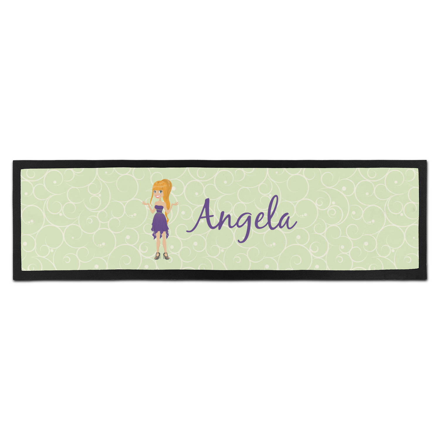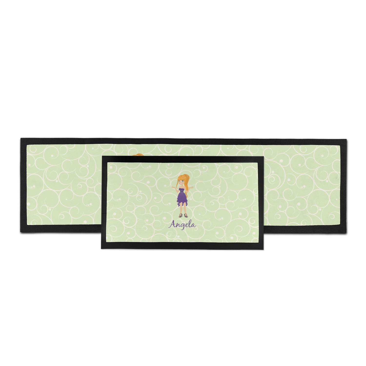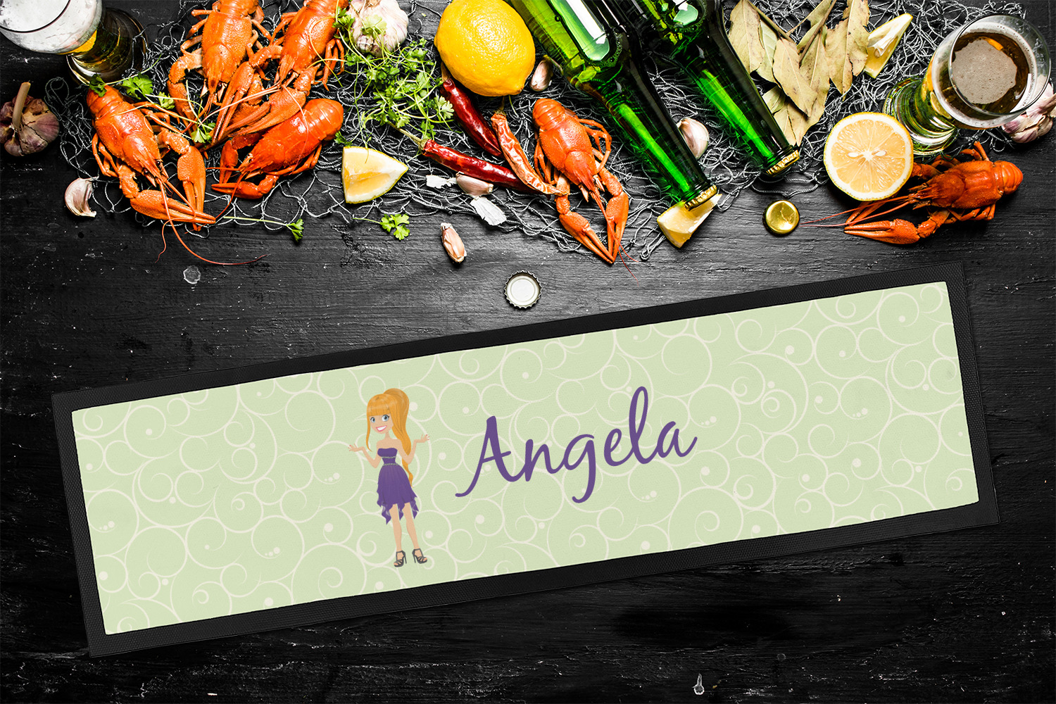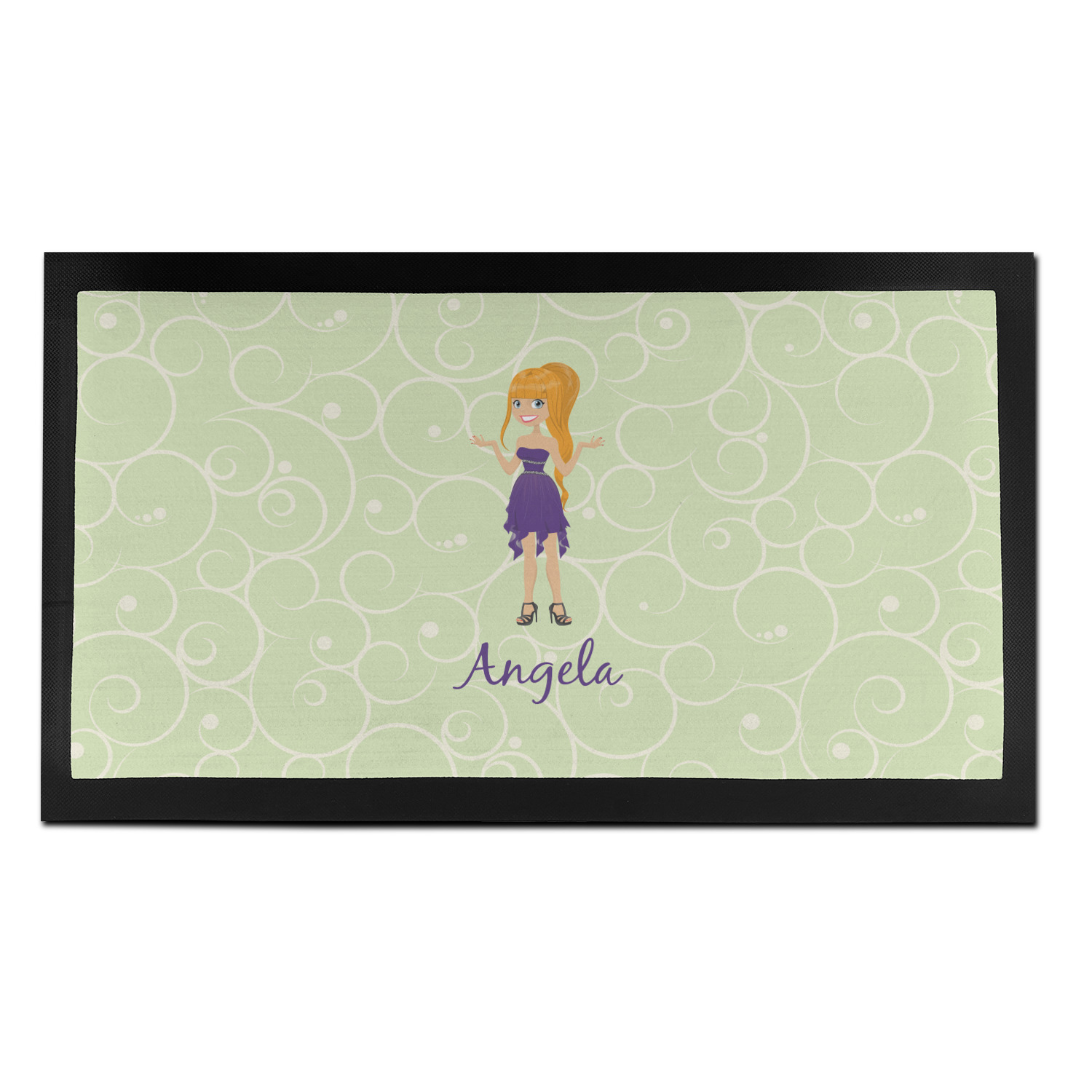 This design was built with a swirls background in a light green and cream color. We chose woman 1 wearing dress 3 and gave her blond hair, light skin, blue eyes, a purple dress and silver shoes. We personalized the design with her name.