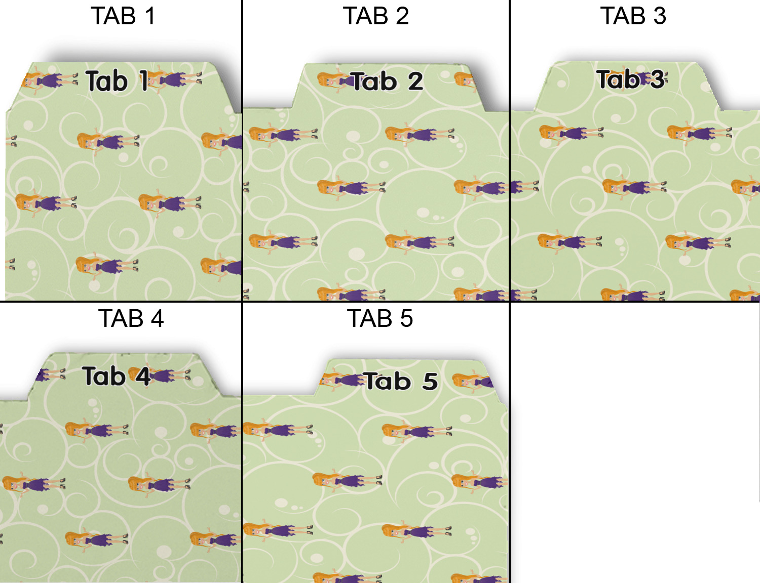 Whether you use binders at school or at work, we have designs to suit all of them. Available in 5 or 6 tab sets, you are sure to find a set to suit your needs. The back of each one is white and can be used to take notes, write vital information on, etc.