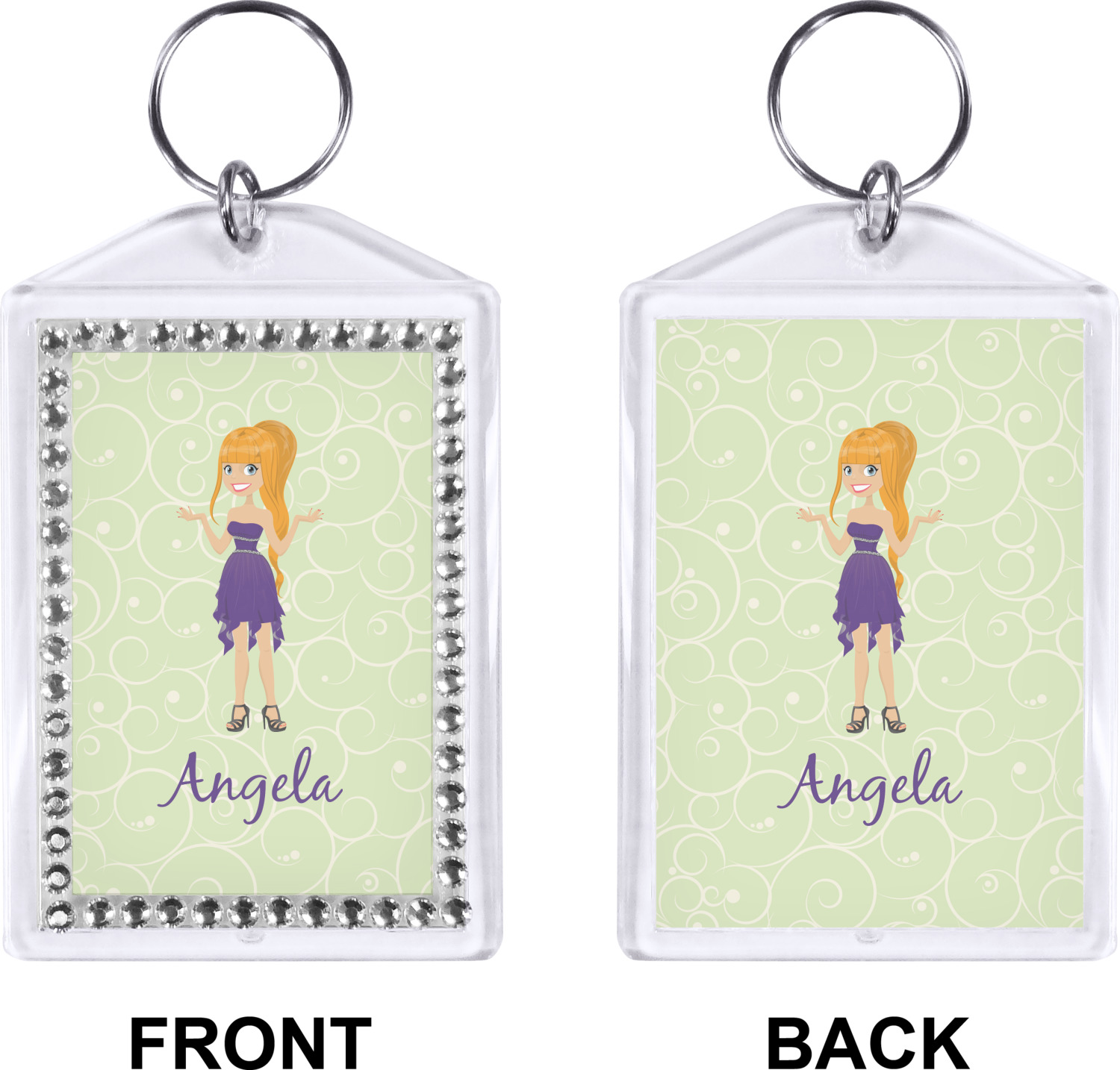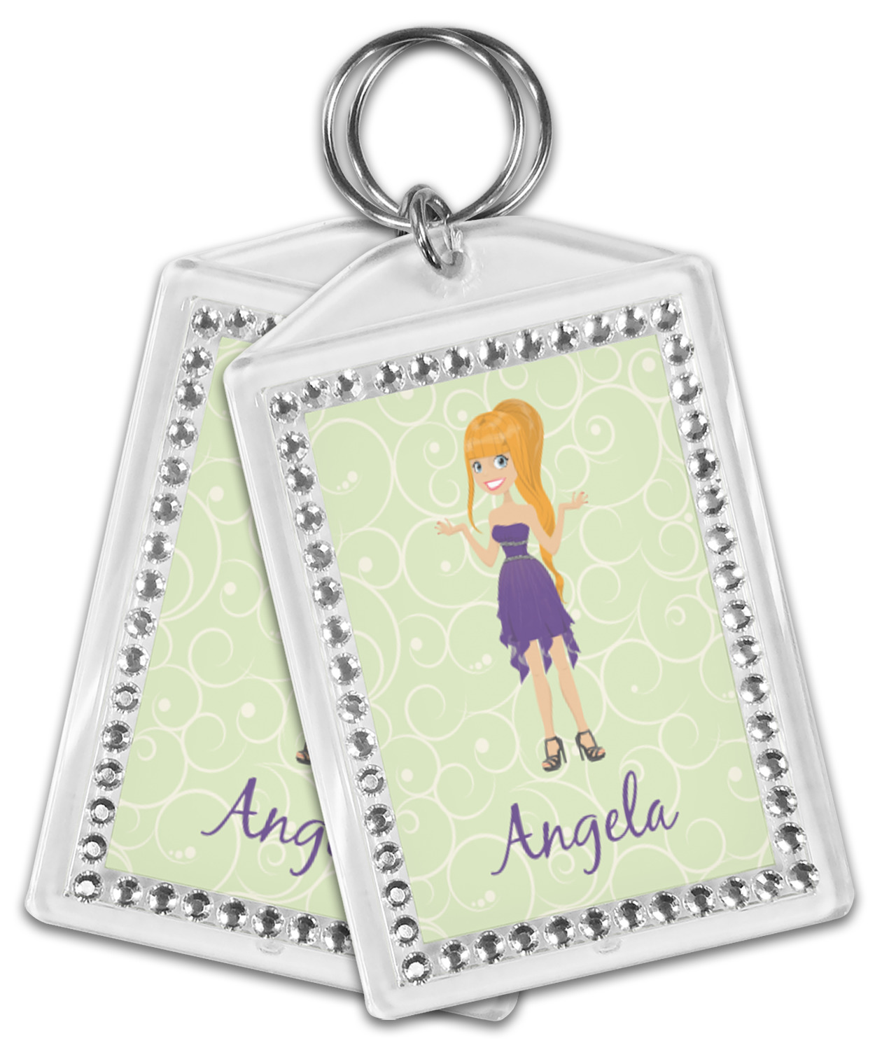 Our personalized keychains have a bold, rectangular shape, outlined by a series of shimmering rhinestones. A metal, split keyring is included with your purchase, and an additional metal hoop allows for attachment of the keychain to the split ring. This unique keychain measures at about 3.75 by 2.5 inches. We print your customized design(s) across both the back and front of this keychain.