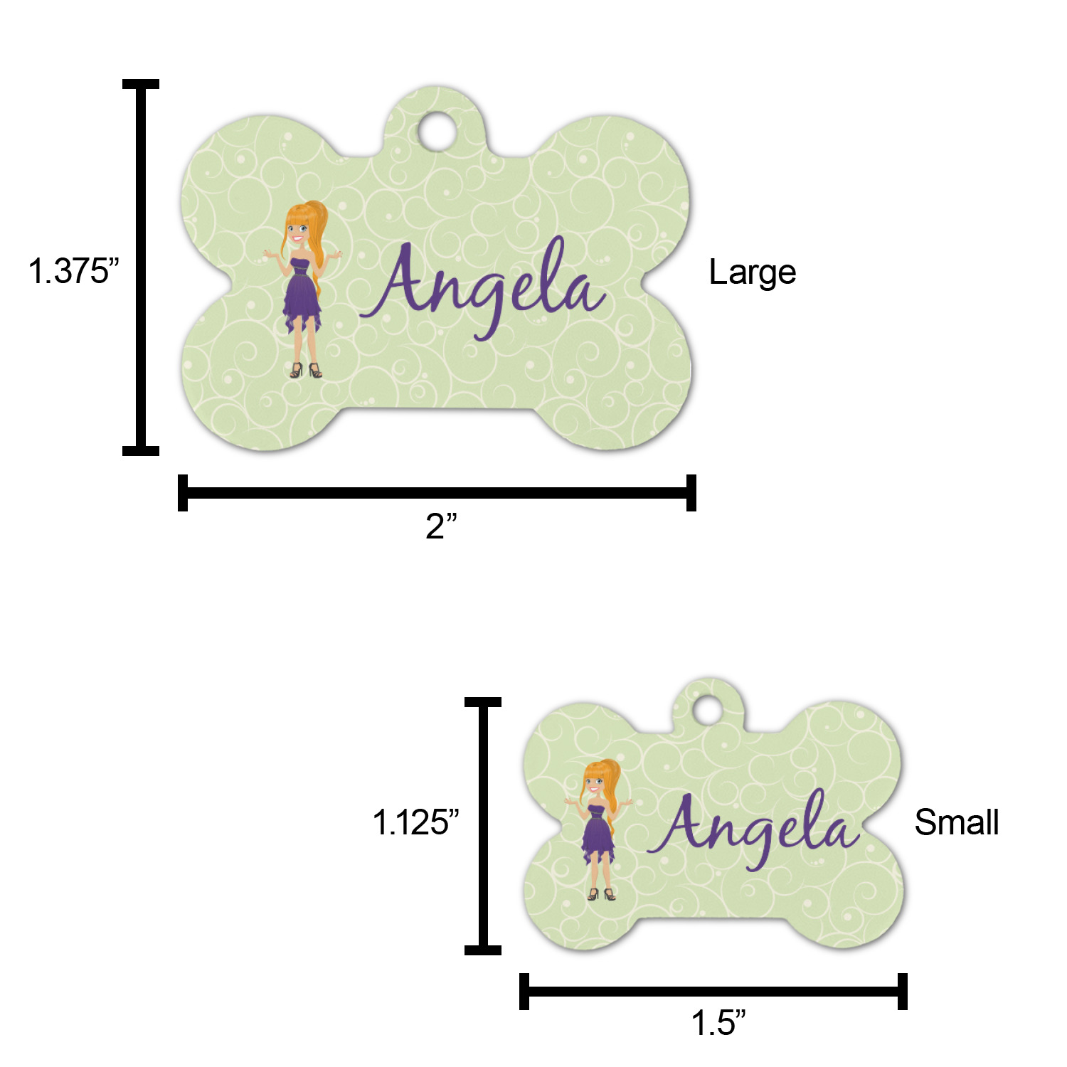 The small bone dog tag size is perfect to pair with our small dog collars, the large size pairs well with our large dog collars.