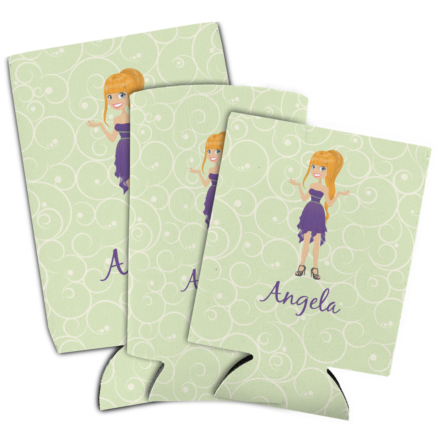 This design was built with a swirls background in a light green and cream color. We chose woman 1 wearing dress 3 and gave her blond hair, light skin, blue eyes, a purple dress and silver shoes. We personalized the design with her name.