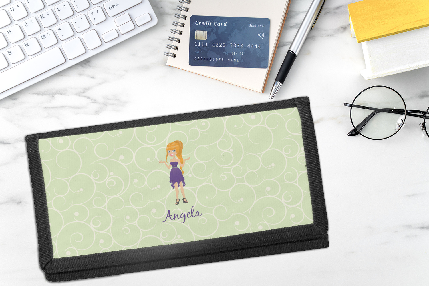 The checkbook cover is made of a durable canvas and the front flap is decorated with a vibrant design of your choosing. With 4 slots for credit cards or IDs, and 2 compartments for your checkbook register, cash, receipts, business cards, and more; this checkbook cover could easily double as a wallet.