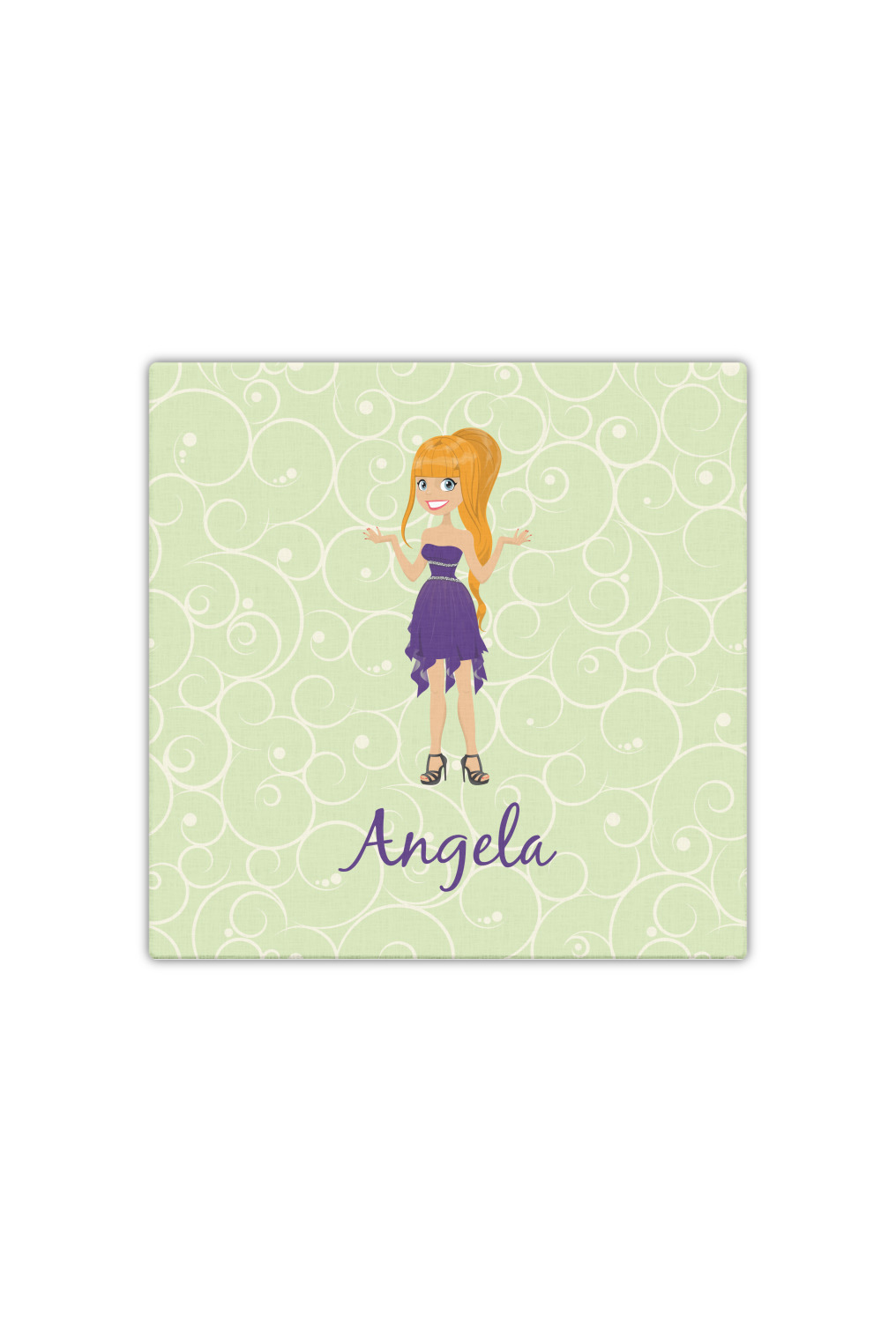 This design was built with a swirls background in a light green and cream color. We chose woman 1 wearing dress 3 and gave her blond hair, light skin, blue eyes, a purple dress and silver shoes. We personalized the design with her name.
