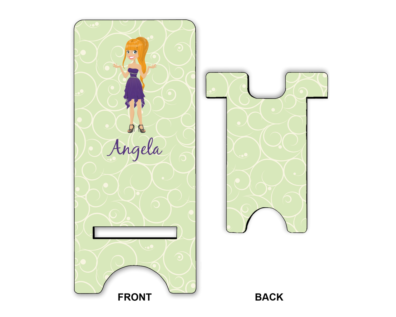 This design was built with a swirls background in a light green and cream color. We chose woman 1 wearing dress 3 and gave her blond hair, light skin, blue eyes, a purple dress and silver shoes. We personalized the design with her name.