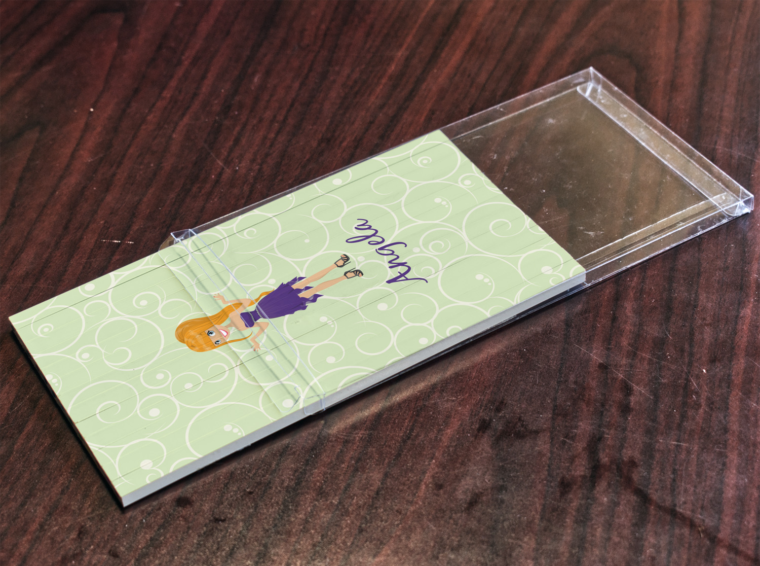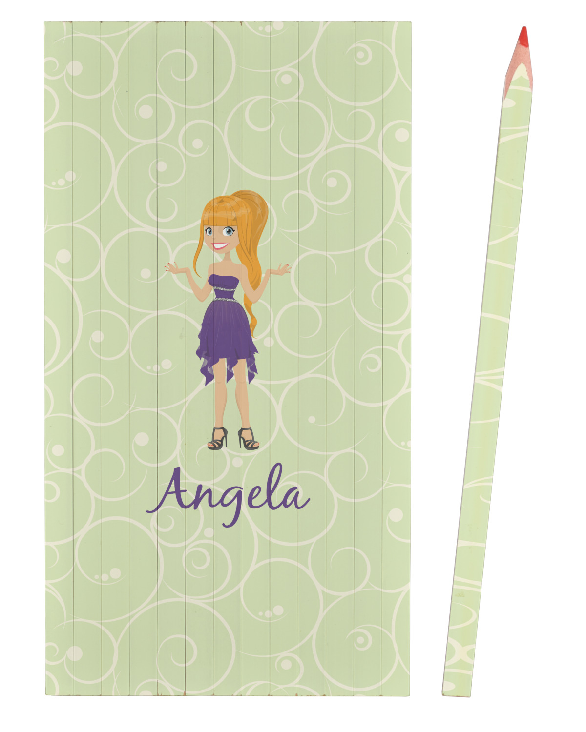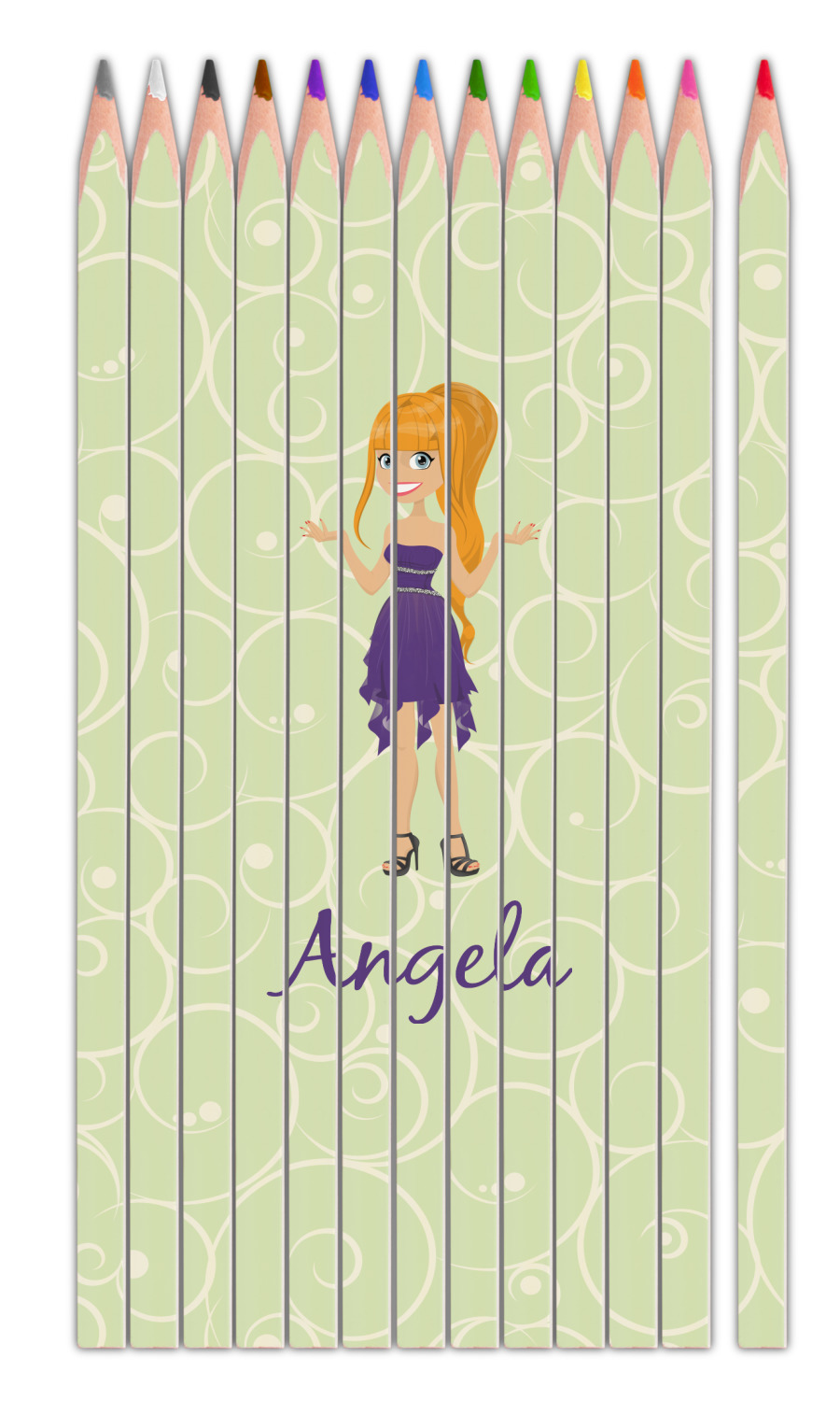 This design was built with a swirls background in a light green and cream color. We chose woman 1 wearing dress 3 and gave her blond hair, light skin, blue eyes, a purple dress and silver shoes. We personalized the design with her name.